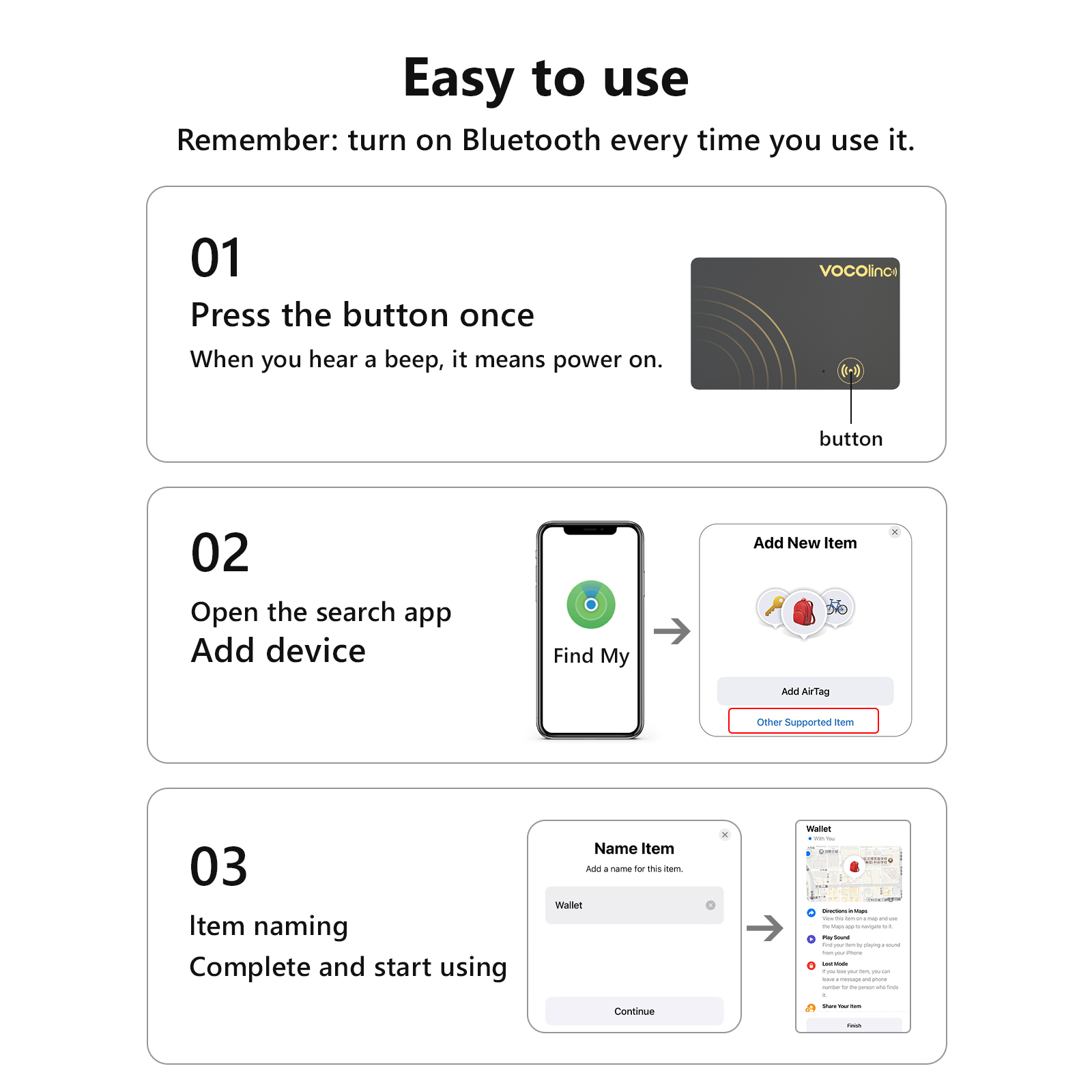 Open “Find My” and Bluetooth, tap “Add Item” and “Other Supported Item”, and then the pairing will be completed within 30 seconds.The VOCOlinc tracker can only be connected to one Apple device at a time.