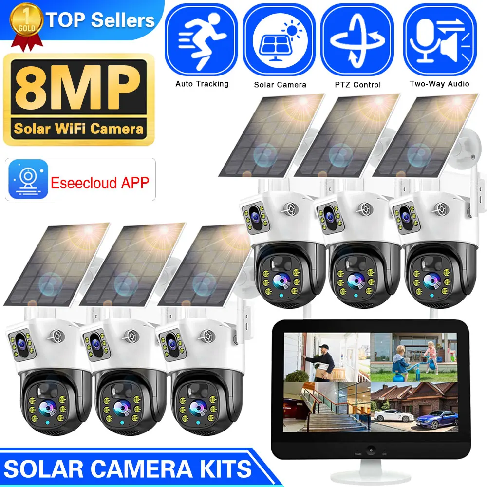 100% Wire-Free Solar PTZ Dual Lens 12.5″ LCD Monitor 10CH WiFi NVR Home Security IP Cam System Wireless 4K 8MP CCTV Surveillance