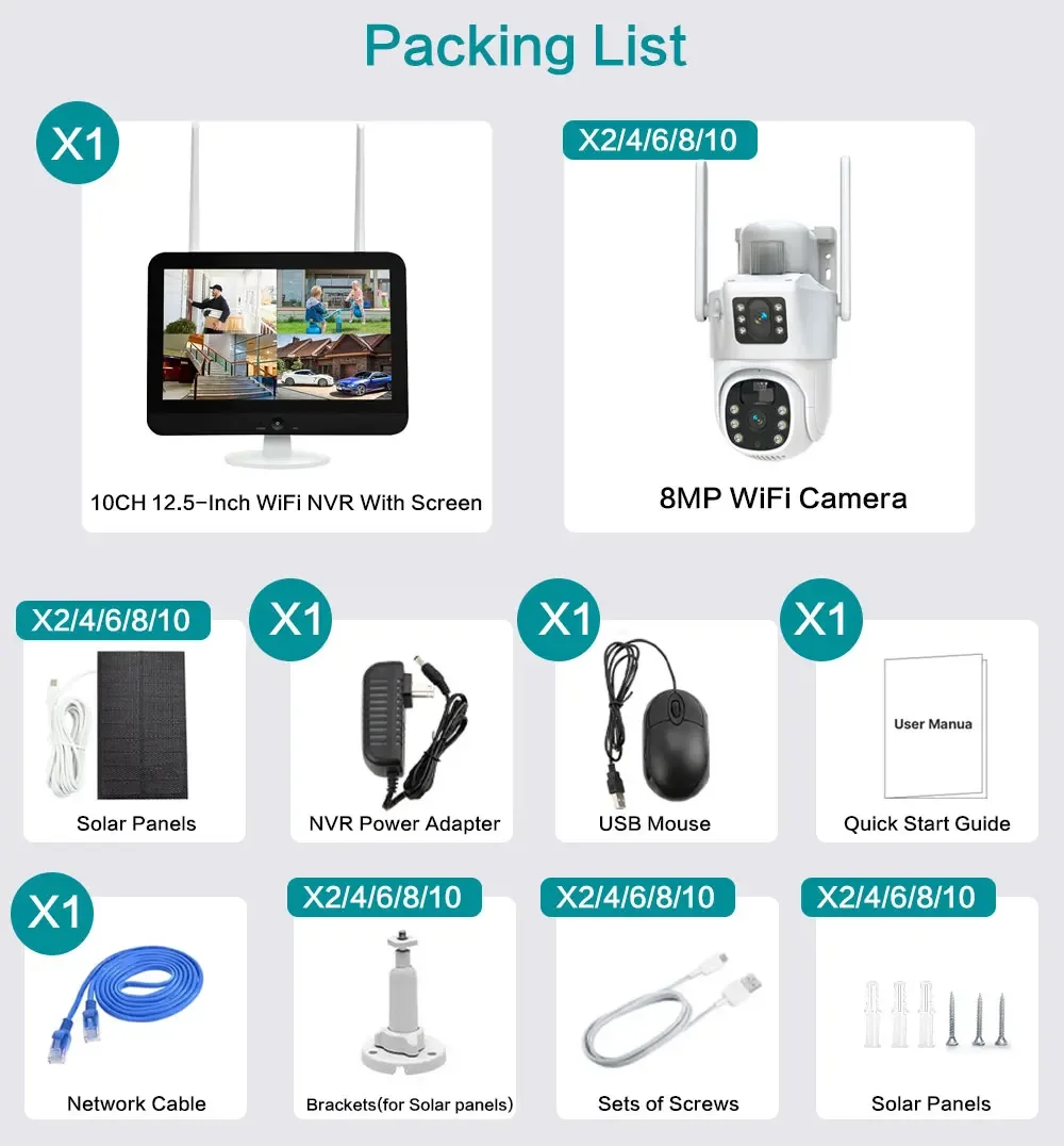 This wireless security camera system with 12.5 inch monitor, you can have a high definition image during the real time monitoring, you don't have to buy a seperate screen, save more money, and more space. You just need power on the camera and NVR, then the images will show on the screen for you. The really plug and play. And you can view the 10 cameras at the same time on the screen.