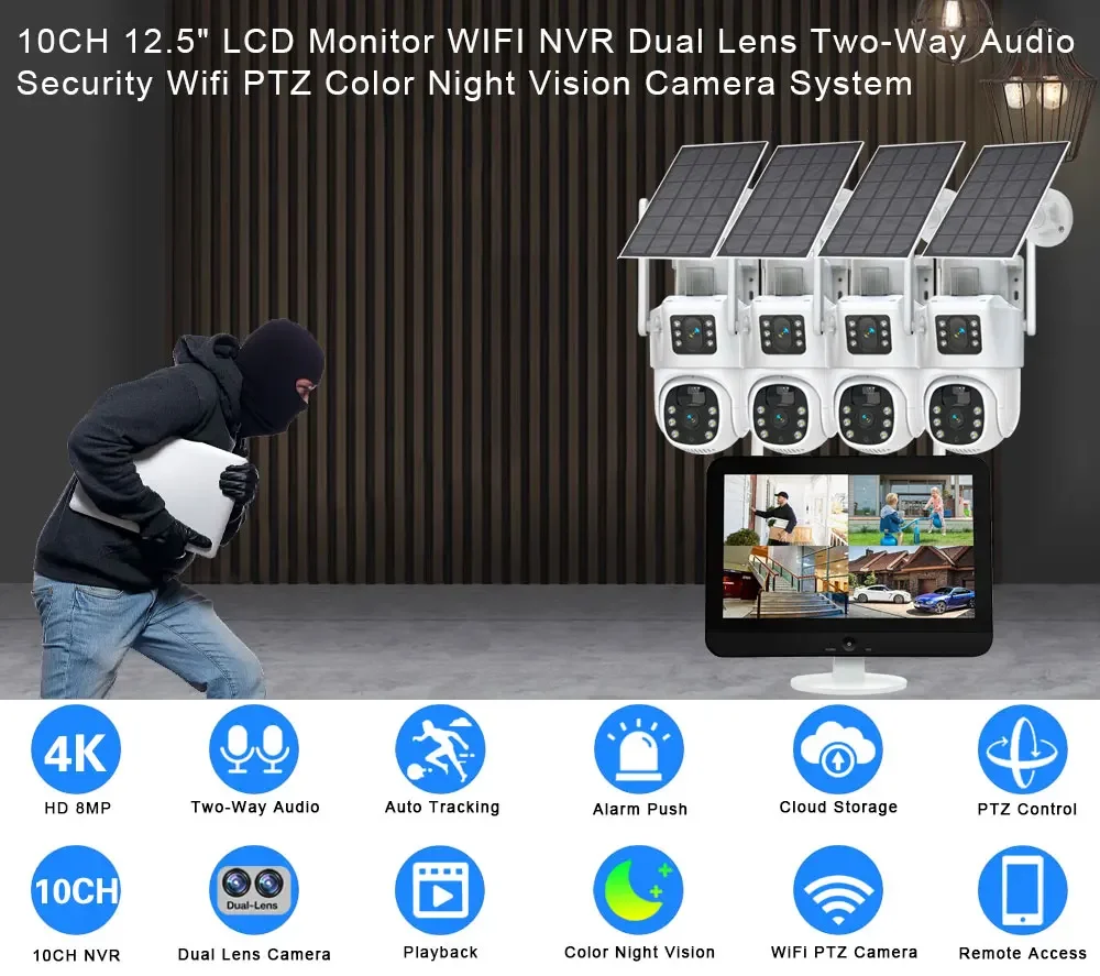 10CH Wireless NVR 4k 8mp Dual Lens Wifi Solar PTZ AAuto Tracking Video Surveillance System External Monitoring Cctv Camera Kit