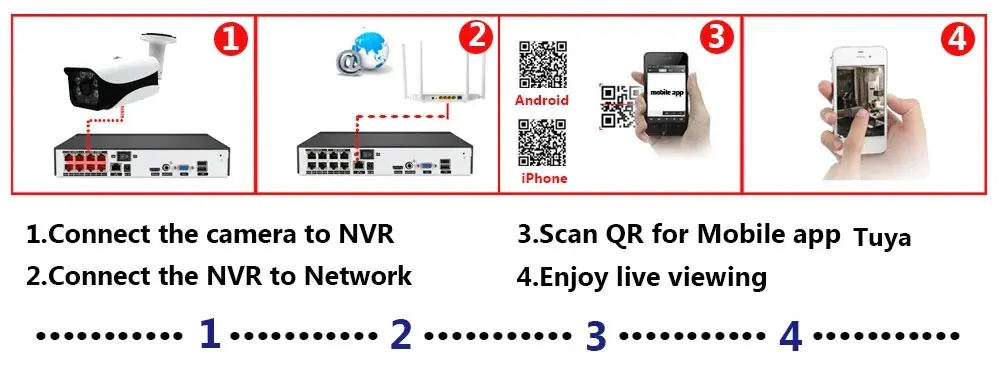 Easy setting , just 4 steps for mobile phone viewing,View live video of the system from anywhere and anytime via you smarphone, table or PC with advanced P2P technology, you are able to remote access your system in minutes or less, no portforwarding needed, remote access has never been so easy!!!