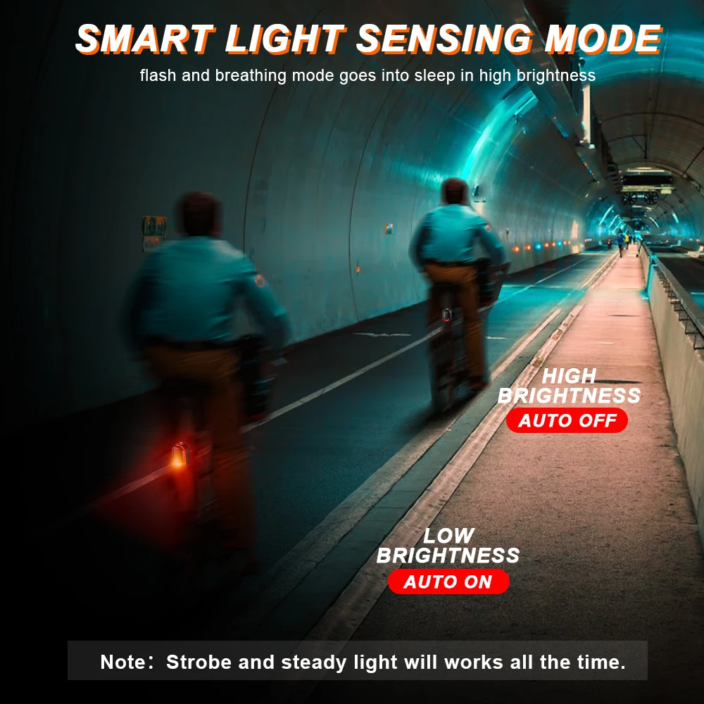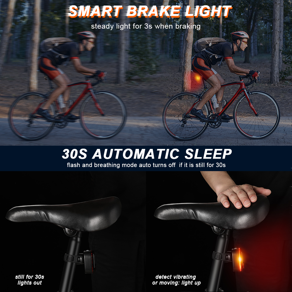 【A5Pro Smart Brake Sensing Technology】A5Pro Designed with the brake sensor, Automatic ultra-bright brake light will automatically light up after braking. The bicycle light is super bright and highly visible from a distance, really catch attention to enhance your safety.