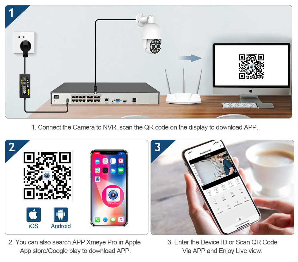 Supports Smartphone iCSee App (iOS, Android), tablets (iPad, Android), Windows PC CMS client. This is the most convenient way to watch from anywhere, anytime.