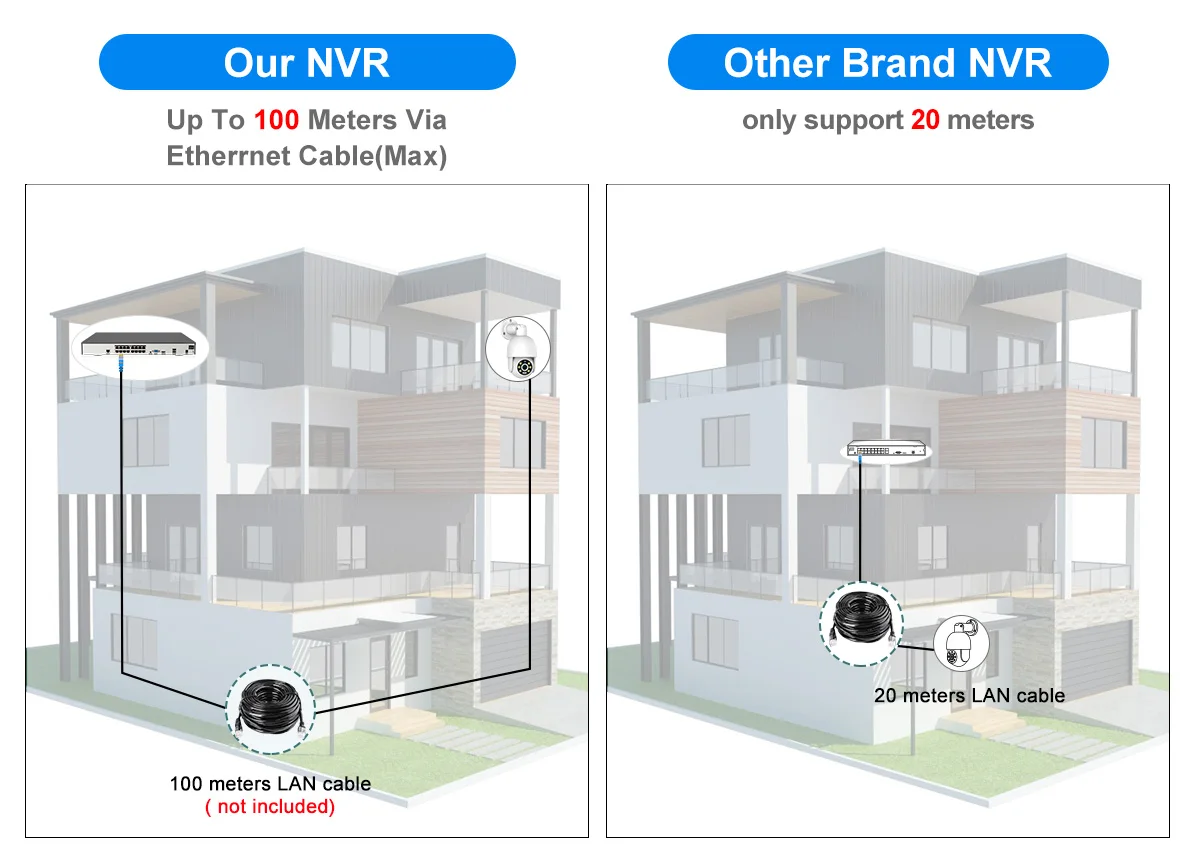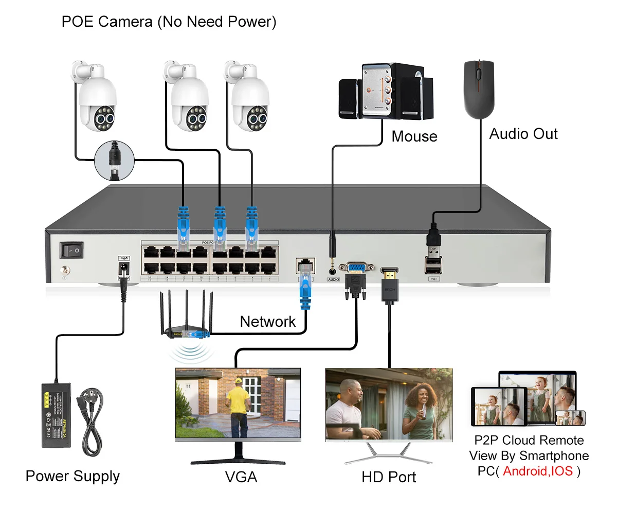 Power over Ethernet means the IP cameras connect to the NVR with a single cable that transmits both data and power, No need to connect power cable, simplified the installation and reduced costs and easy to set up.