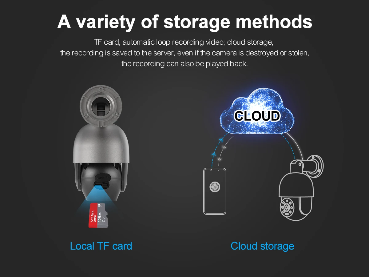 ● Support Two Modes Recording: Free 30-day cloud storage, Max 128G SD card Record, data security is more stable ;