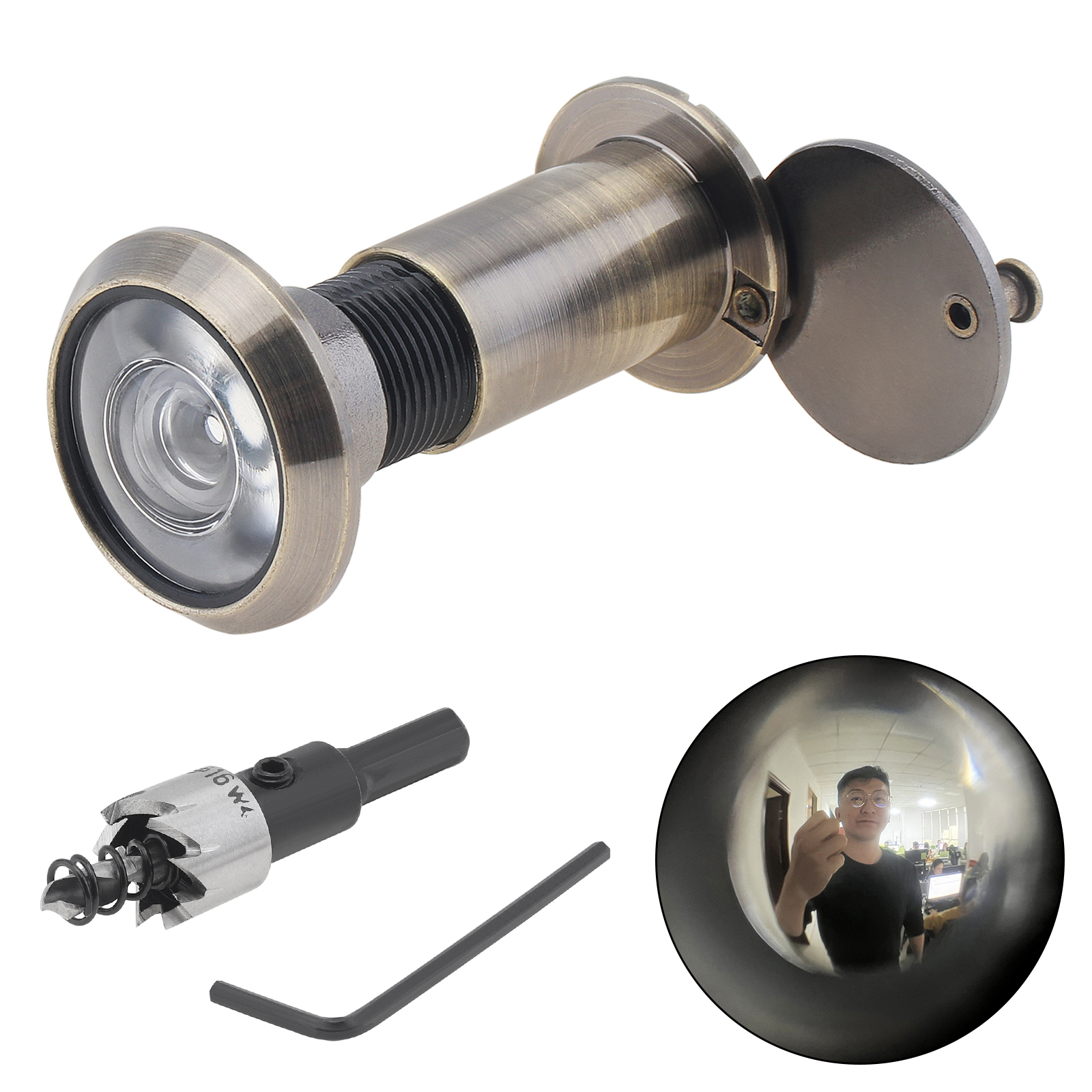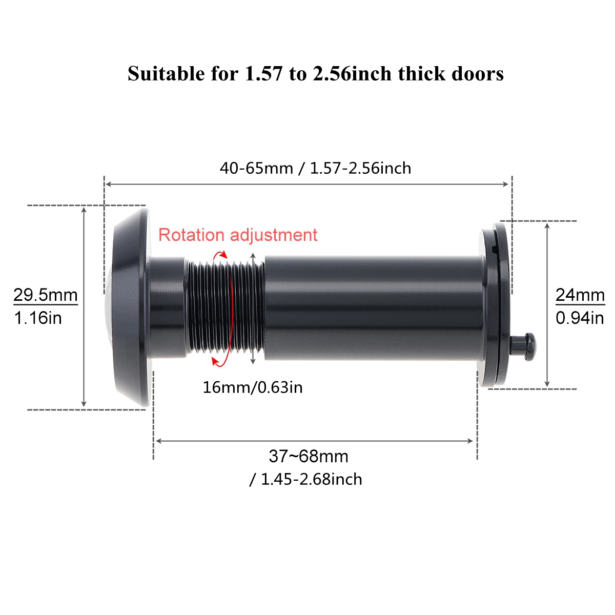 – The door viewer with zinc alloy metal with super simple installation. Suitable for 1.57 to 2.56inch thick doors, simply drill a suitably positioned 0.63inch diameter hole, insert the viewer into the hole then screw the two sides together and tighten by hand.After installed it, you could see a lot of the area.