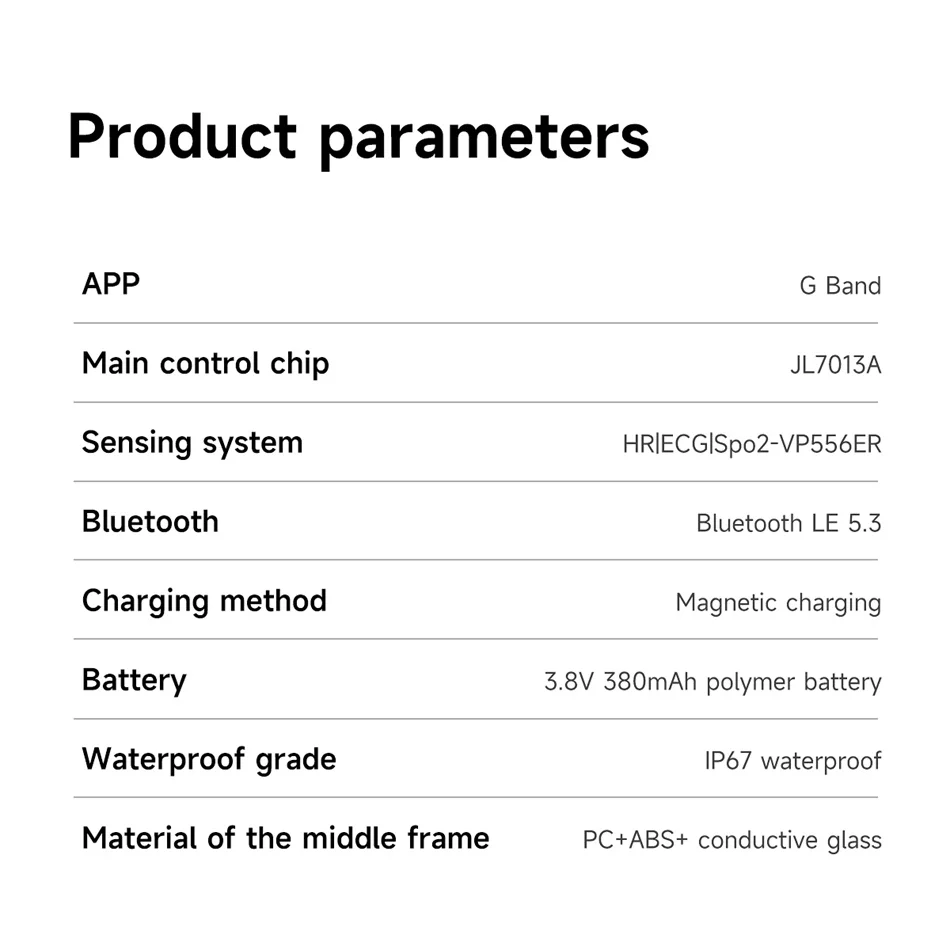 Reminder Functions: Alerts for high exercise heart rate, app pushes, alarms, sedentary, goal achievement, low battery and Bluetooth disconnection. Other Functions: Stopwatch, weather display, breathing training, timer, female menstrual cycle reminder, music control, flashlight, calculator.