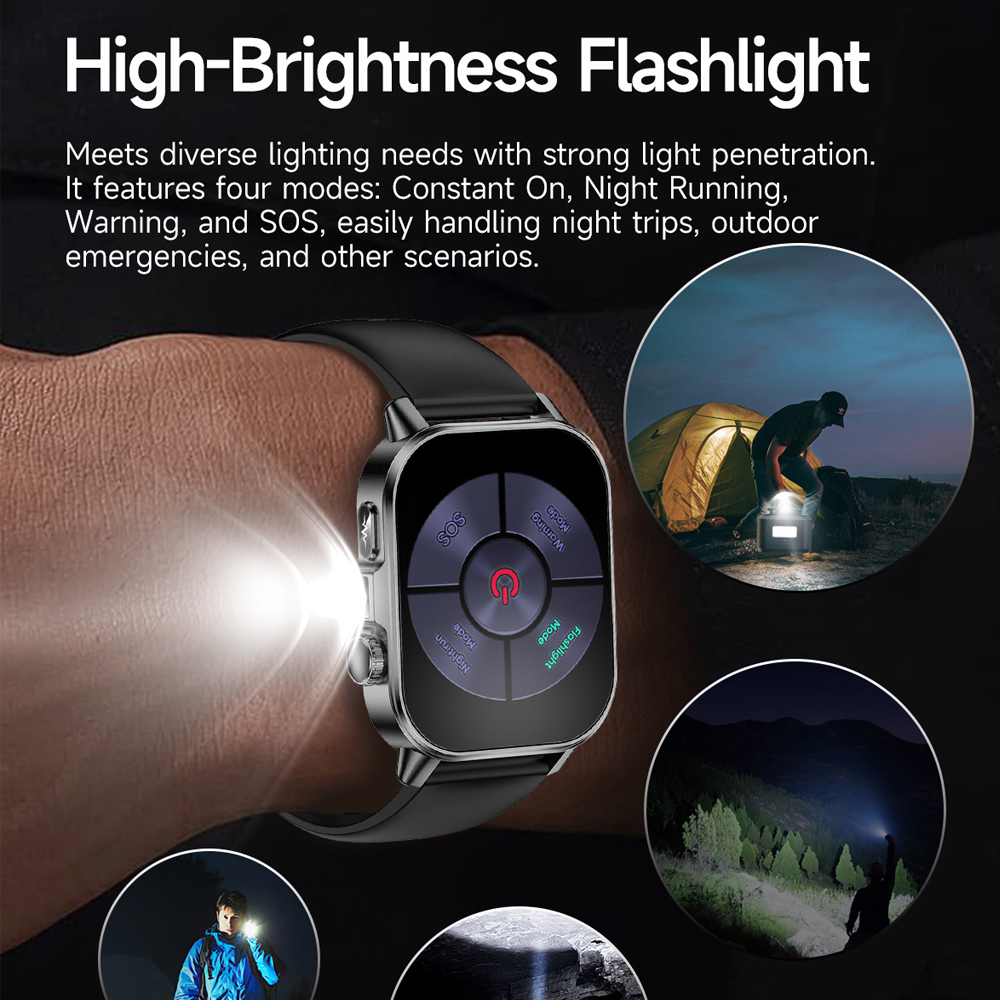 High-intensity torch, step/calorie/distance tracking, multiple workout modes, alarm clock, weather forecast, intelligent voice assistant, games, music playback and control, stopwatch, countdown timer, incoming call alerts, alarm reminders, raise-to-wake, social sharing (WeChat, QQ, Facebook, Twitter), etc.