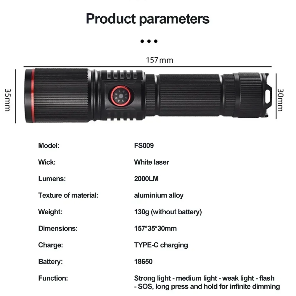 20W Zoom White Laser LED Flashlight High Power Type C Rechargeable Torch Camping Outdoor Hunting Fishing Walking Lighting Lamp