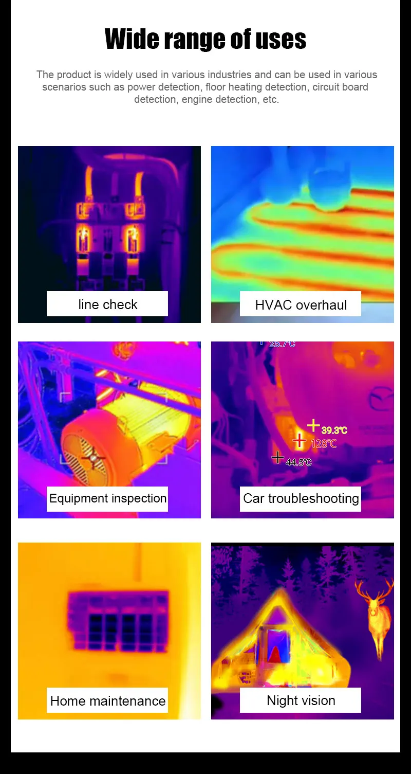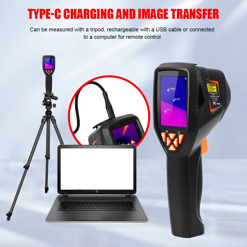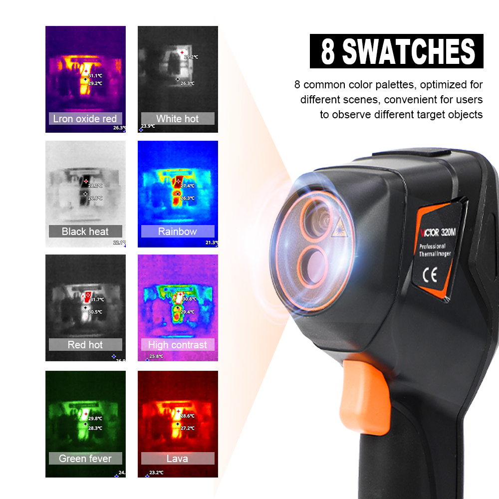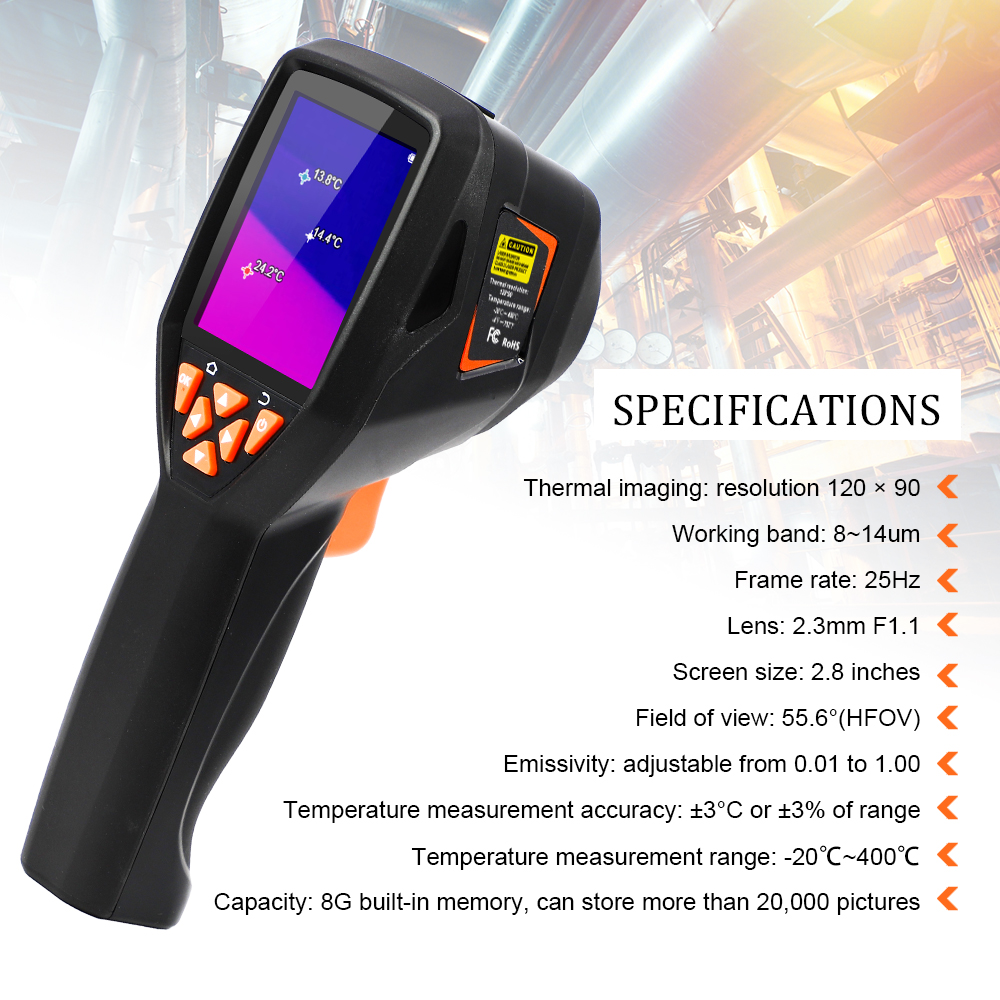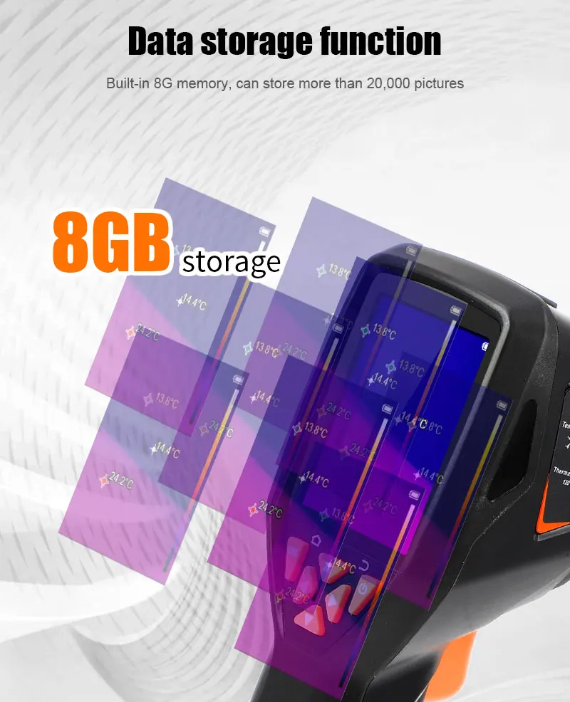 The handheld infrared thermal imager with a 2.8-inch large screen and a built-in high-sensitivity 120×90 infrared thermal imaging core. This instrument also has the features of optional multiple color palettes, multi-language switching such as English, French, Germany etc., image mode selection, built-in 8G memory, etc., which can capture the state of objects more clearly and provide help for different customer needs.
