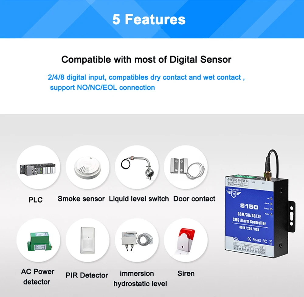 Digital input 3G 4G GSM alarm module with 2 output relay for home automation and M2M, USB programmable, 2G 3G 4G gsm sms alarm module Automatic controller are special for remote switch on/off machine, equipment, and also it supports digital inputs for different detectors like water level detectors, PIR motion detectors and so on.