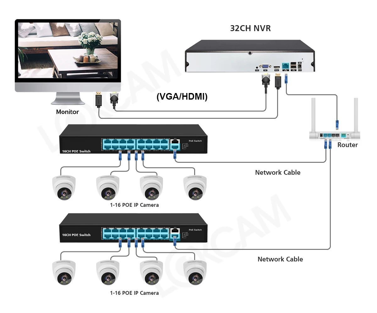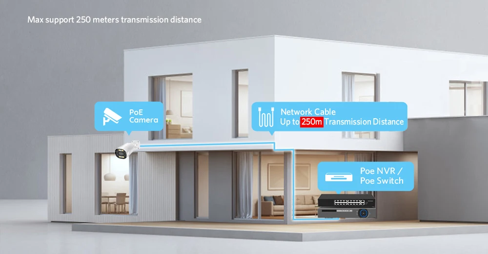 Power over Ethernet means the IP cameras connect to with a single cable that transmits both data and power. No power adapter is required, lower risk of electric leakage and easy to set up, the Poe camera Connection to Poe NVR Support Max 250 meter transmission Distance via Network cable