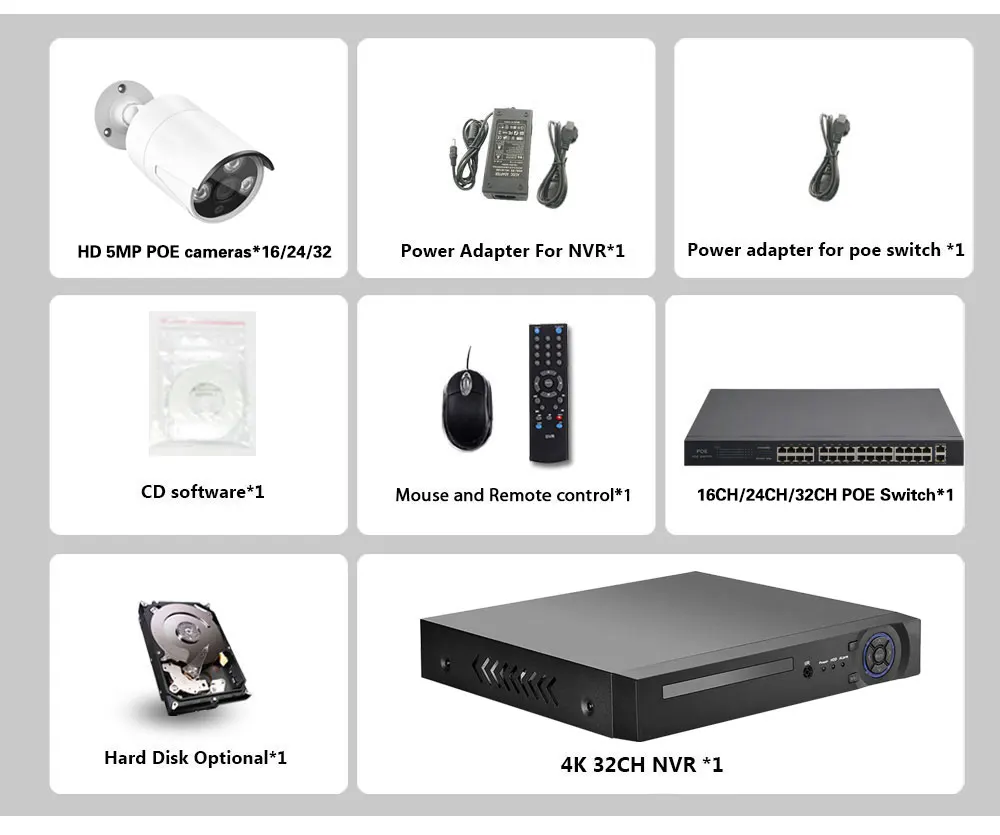 16/24/32 x HD 5.0MP POE IP indoor outdoor IR Day Night vision weatherproof cameras;