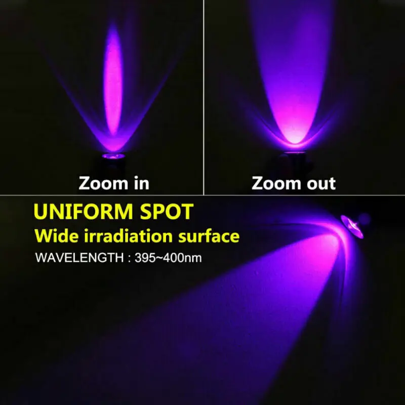 【395NM UV Flashlight 】UV flashlight can easily find room stains, It can detect fungi in food, and check if bills and banknotes have been counterfeited, Can be carried along to detect stains in your car or illuminate minerals, Body art, and Find scorpions.