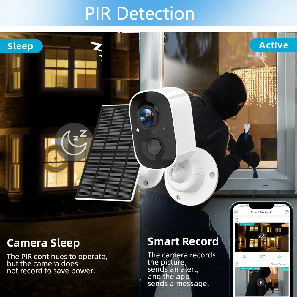 The solar camera security outdoor uses a highly sensitive PIR motion sensor and radar detection to double the control and reduce false alarms caused by rain or insects. The solar powered camera can quickly waking up in 0.2 seconds and steadily capturing all human movements,and send notifications to your smartphone (Android or iPhone)