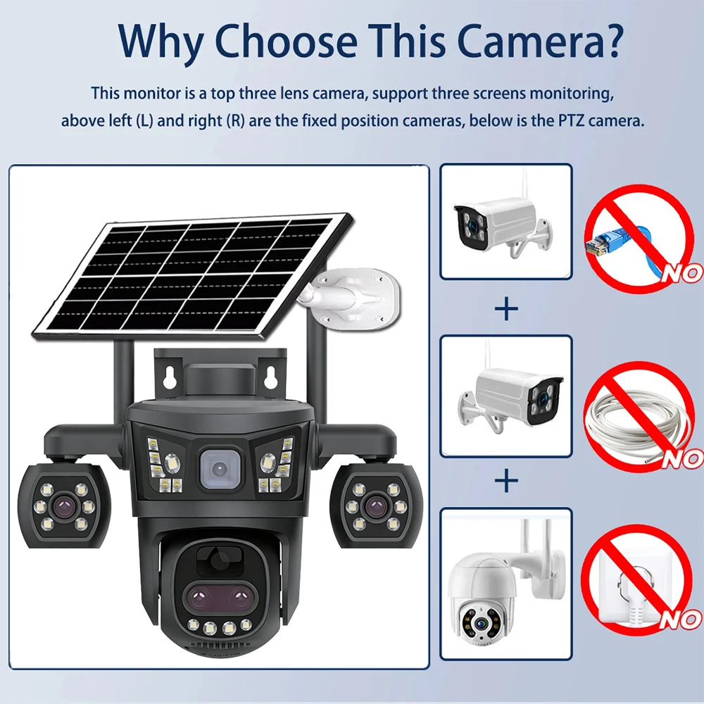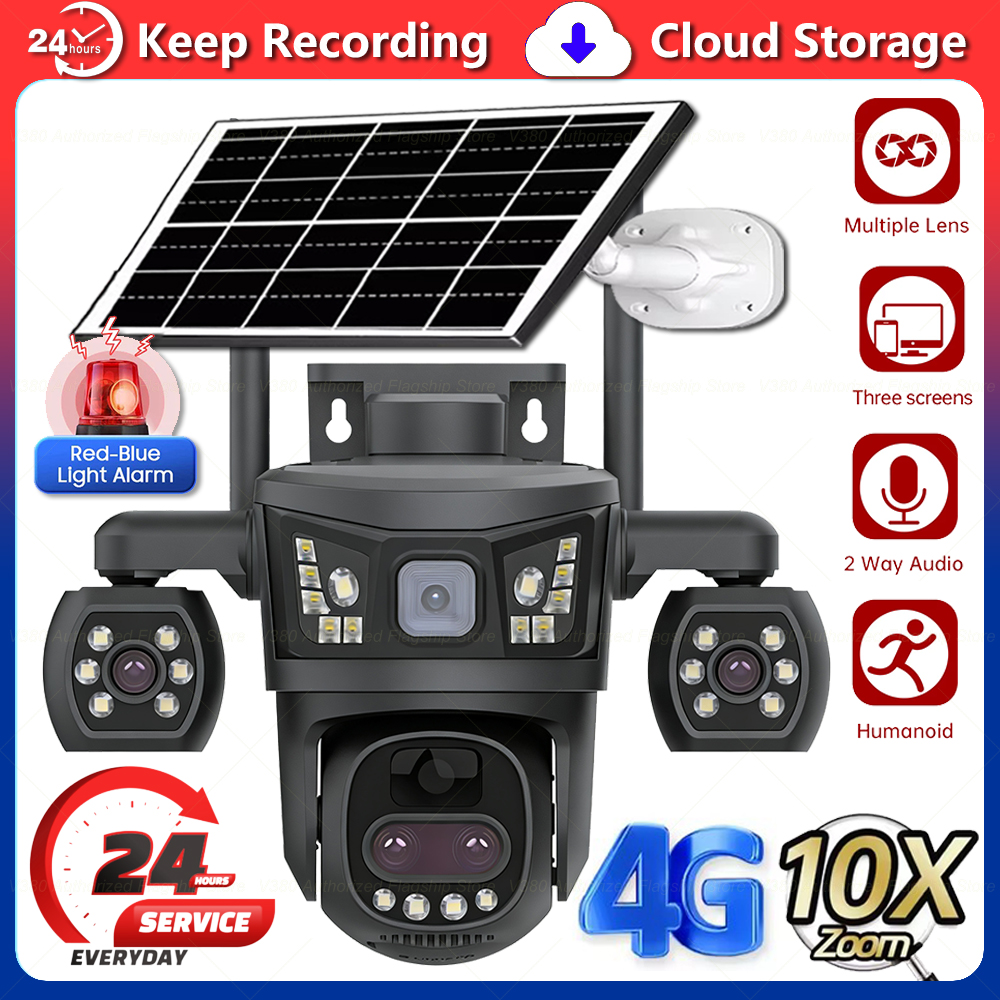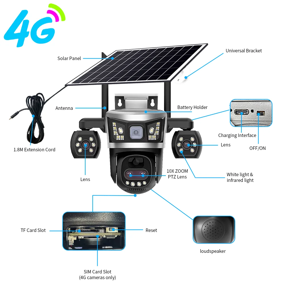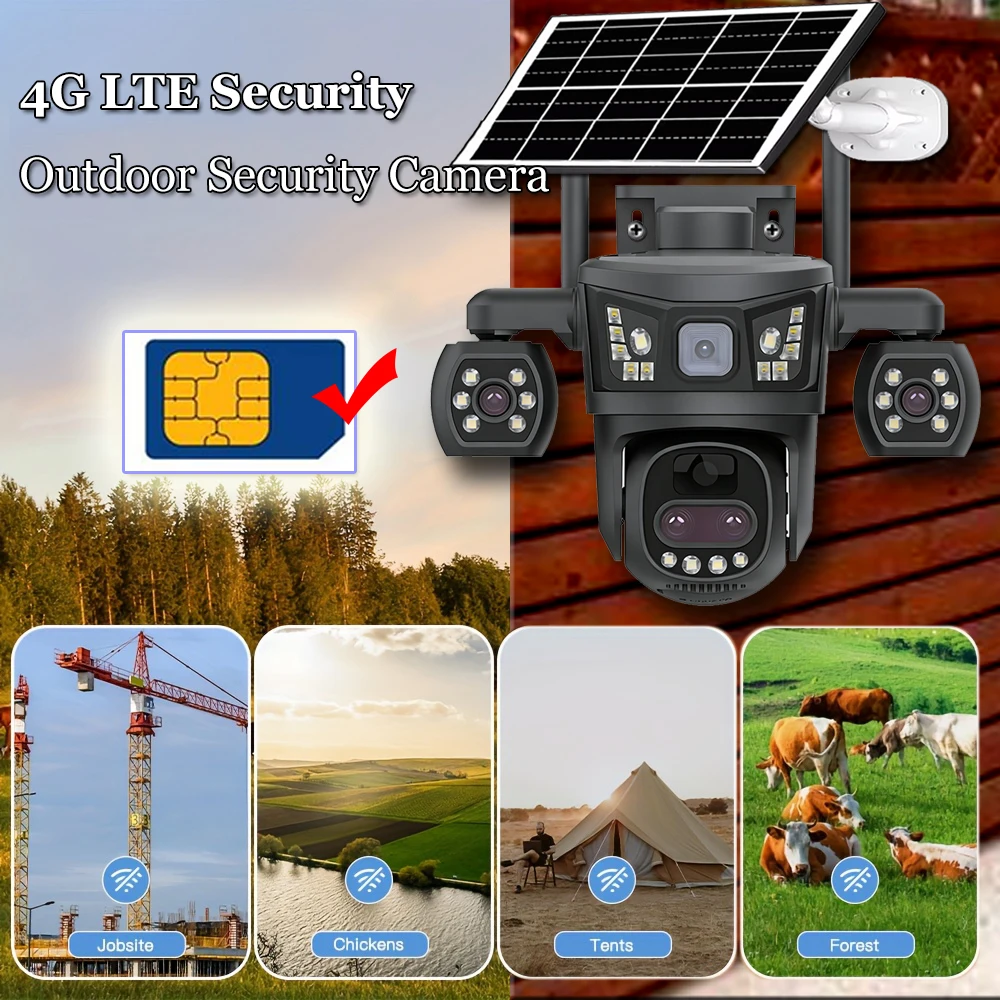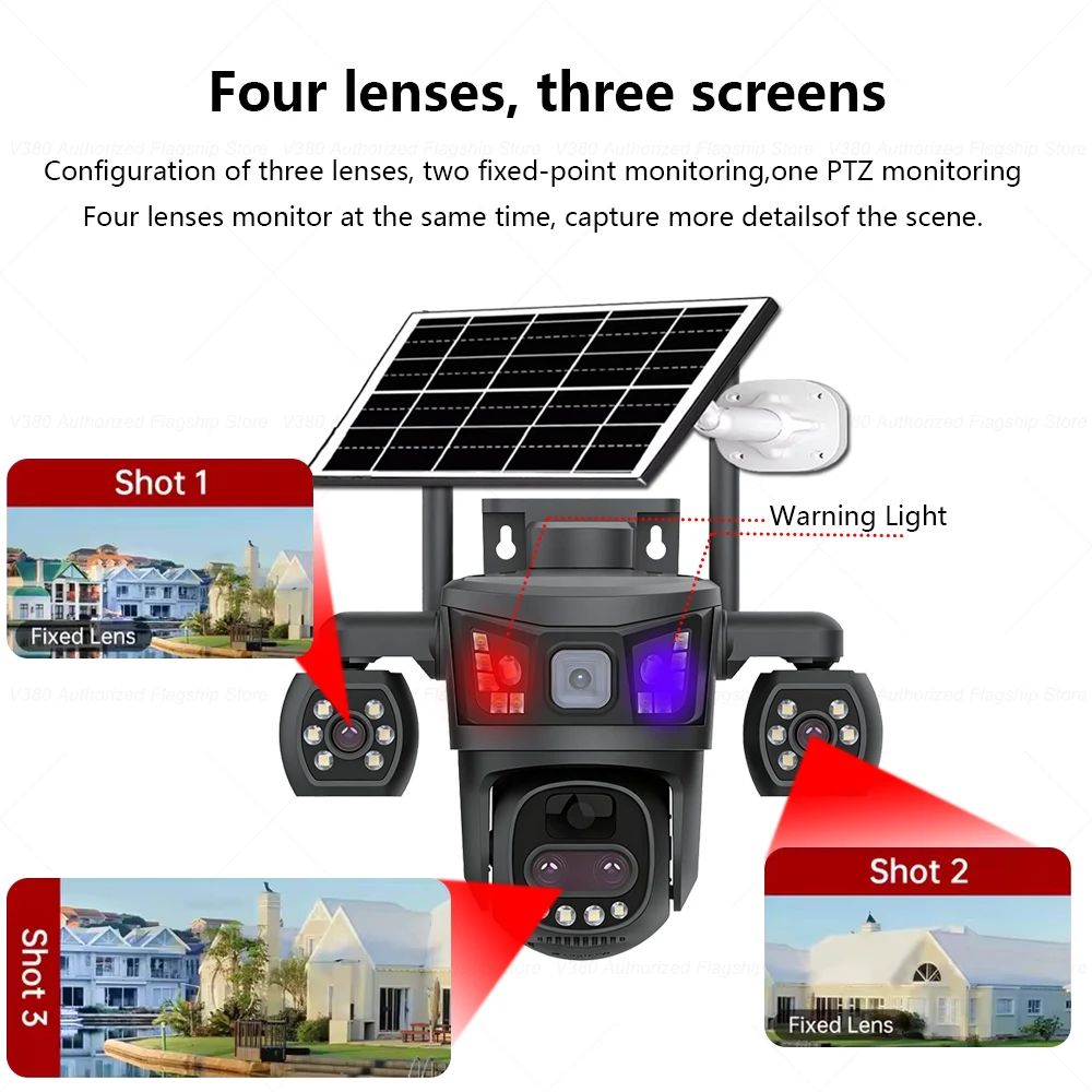 4 Lens 4G Solar Cameras Smart Home Security Protection CCTV Camera PIR Human Detection Alert 10X Zoom IP Surveillance Monitoring
