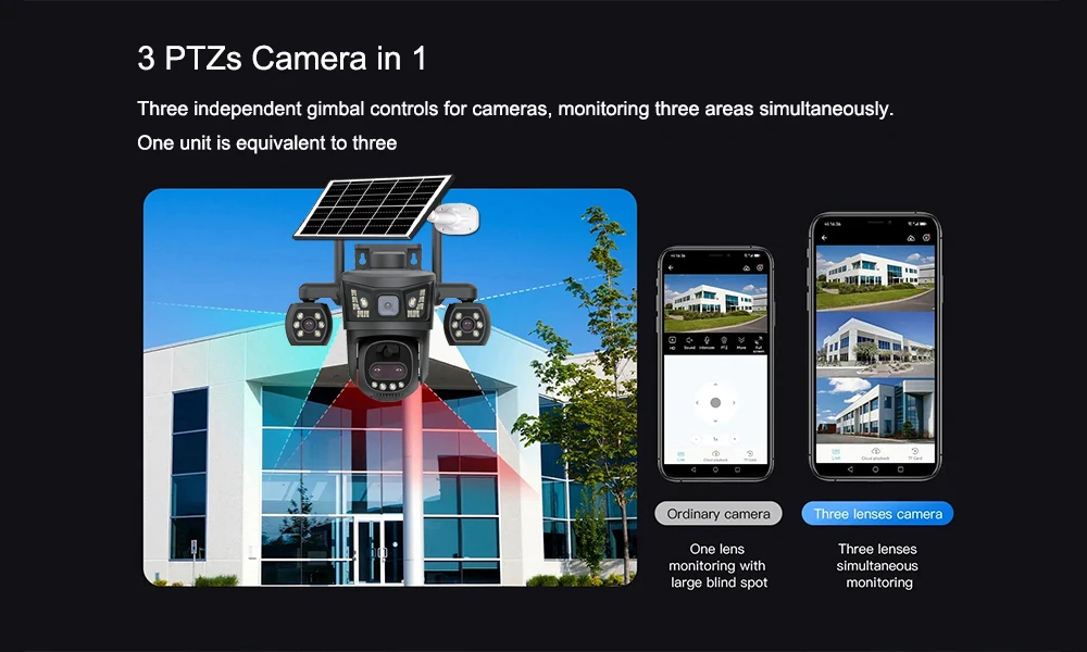 No need to connect wires, with three independent lenses and three monitoring screens, achieving 360 degree no blind spots in monitoring.