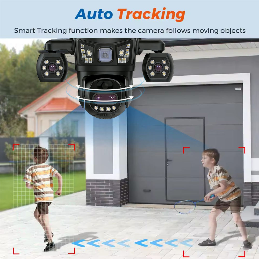 A1:Four-lens & tri-views,Zoom lens, PIR human detection, real-time alarm,auto tracking,two way audio, remote control, multi-share, IP66 waterproof, night vision, dual-storage design.