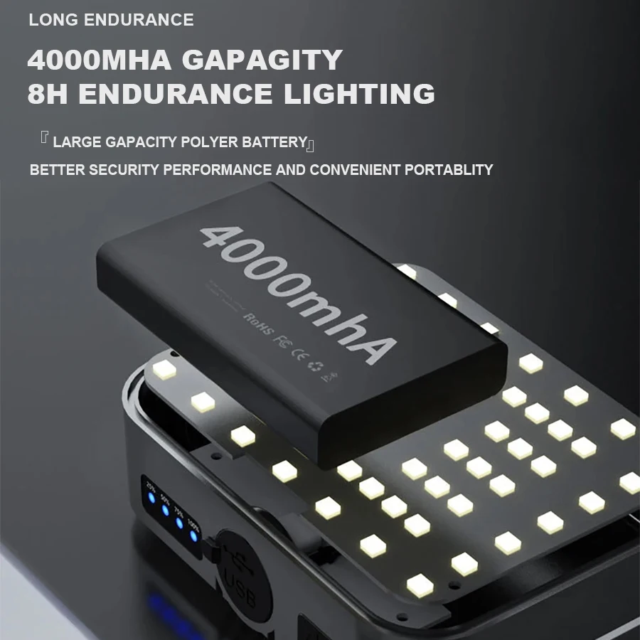 Features support output can be used as a magnet on the back of the charging bank, which can be adsorbed on iron objects as a work light. The back hook design can be used to suspend standing COB dual row red light design plays a warning role. One lamp can be used for multiple purposes and multiple scenarios