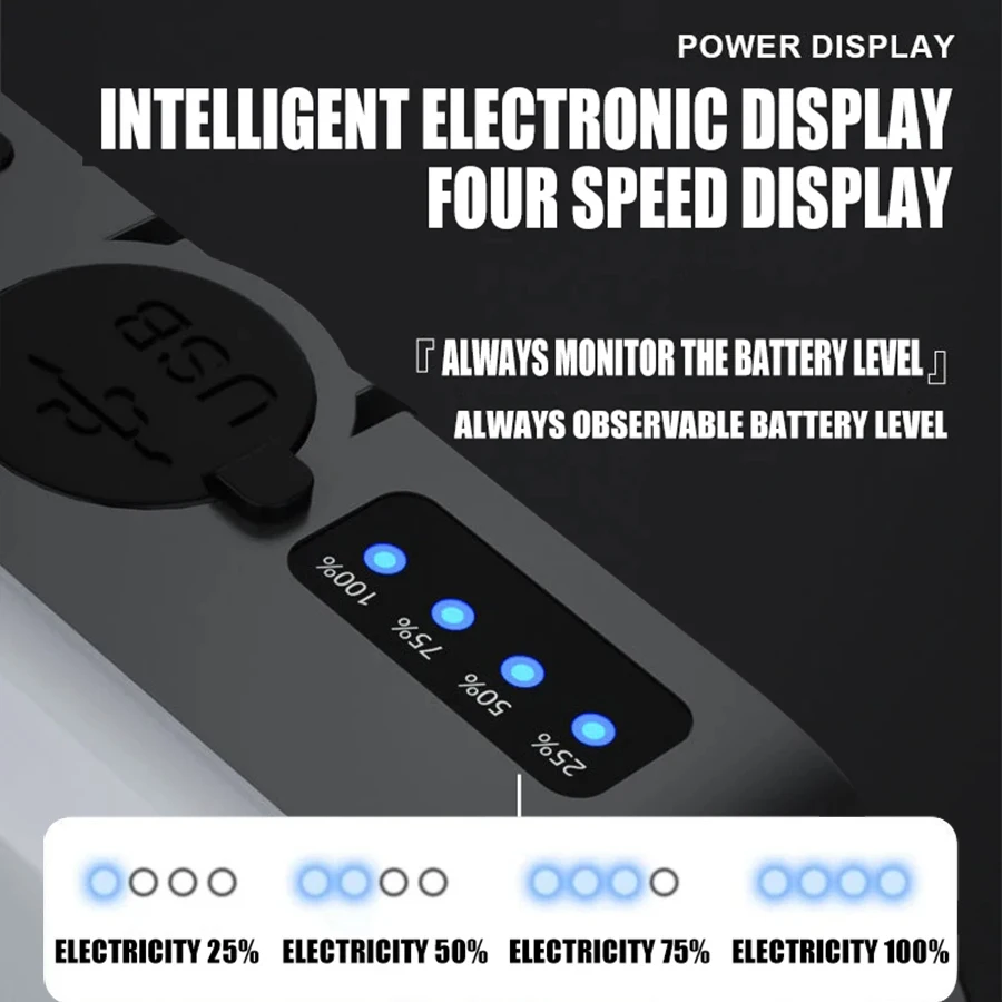 Four blue LED indicators 25% – 50% – 75% – 100% flash in turn when charging
