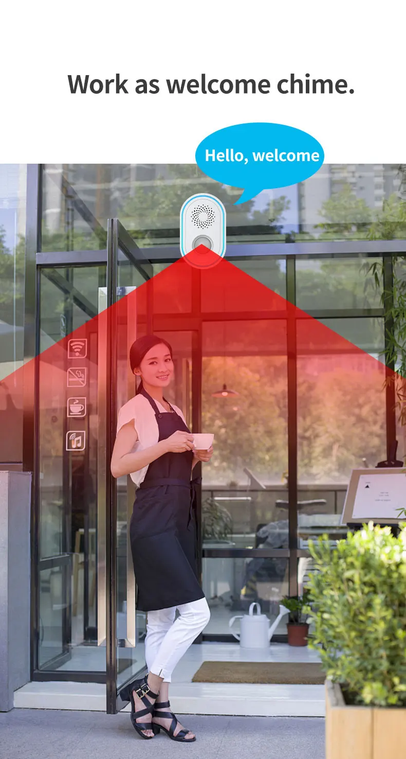 It can be used as a welcome doorbell and installed in supermarkets, restaurants, hotels, shops, etc.