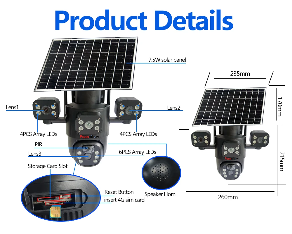 * Packing list: camera, 7.5W solar panel, solar panel plastic bracket, manual, screw package;