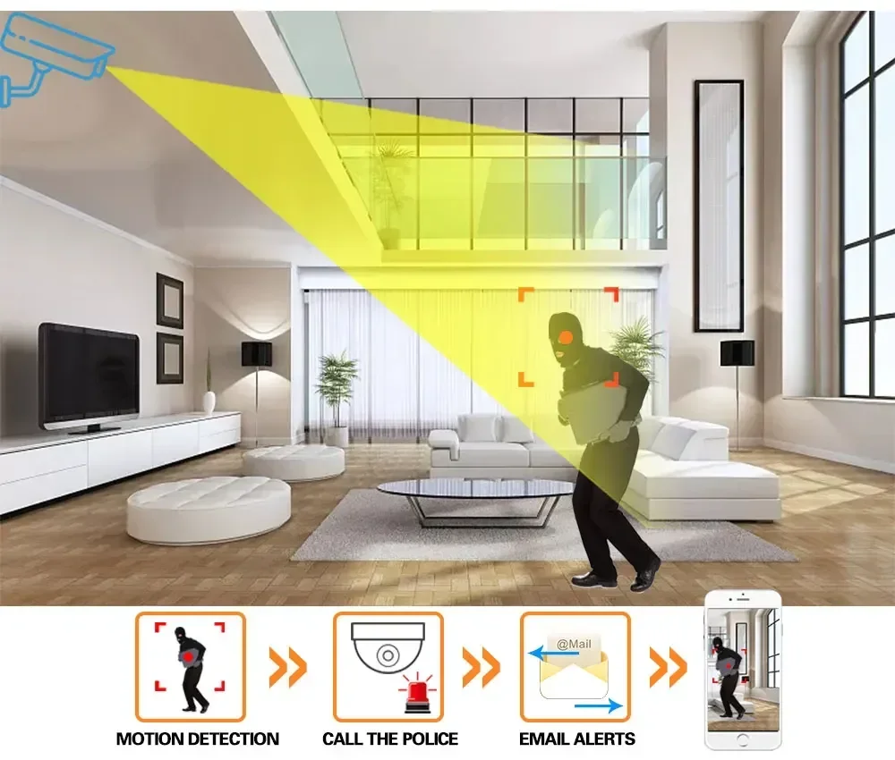 Can set up the area you want to control,When it is triggered,it will send message to your email ,You can get the first hand information ,no matter when and where you are .