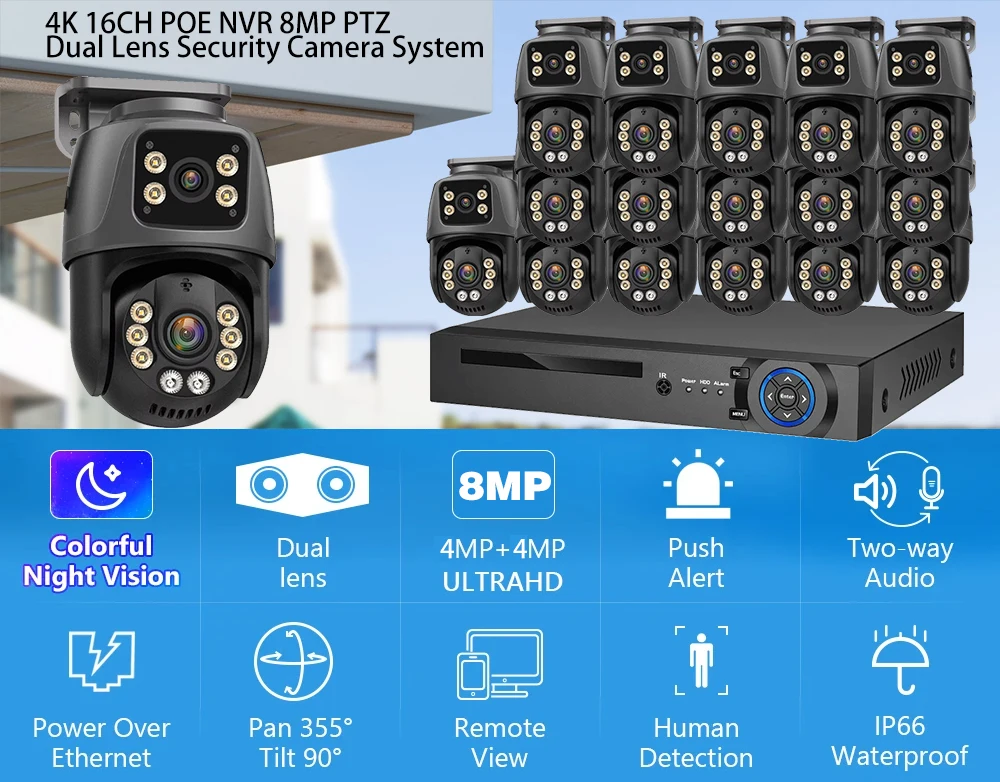 4K 8MP Dual Lens Dual Screen POE PTZ IP Camera CCTV Surveillance Kit P2P 16CH NVR PTZ IP Cameras Security XMEYE ICSee System