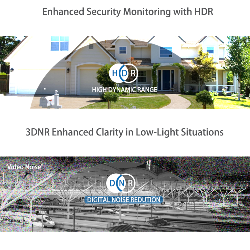 Your security camera uses HDR (High Dynamic Range) technology that works to ensure you capture the most important details, regardless of lighting conditions. Dynamic range is measured as the difference between the brightest point and the darkest point of the video. HDR technology uses this difference to automatically adjust the picture's brightness, resulting in optimized, highly-detailed security video.