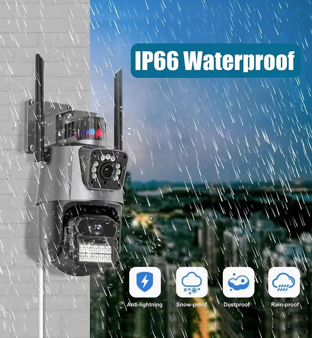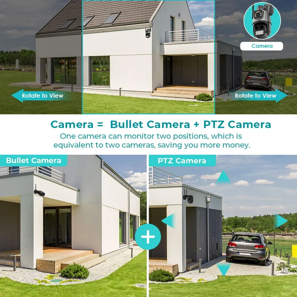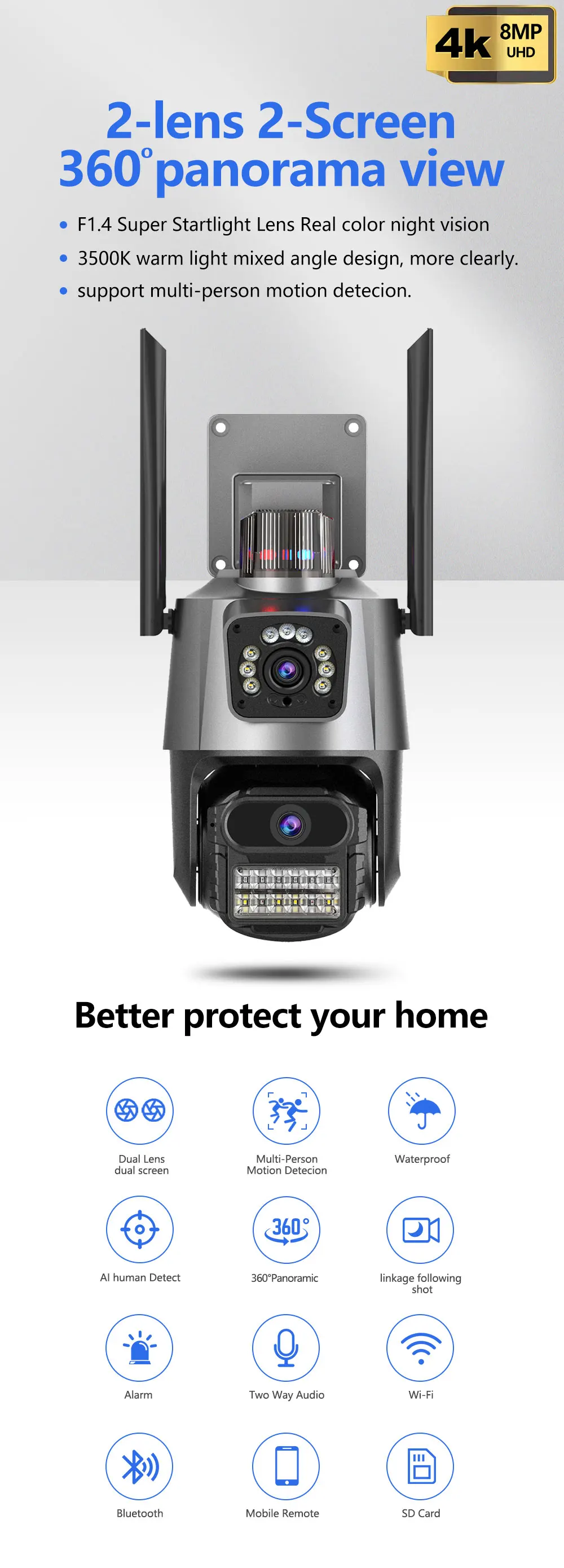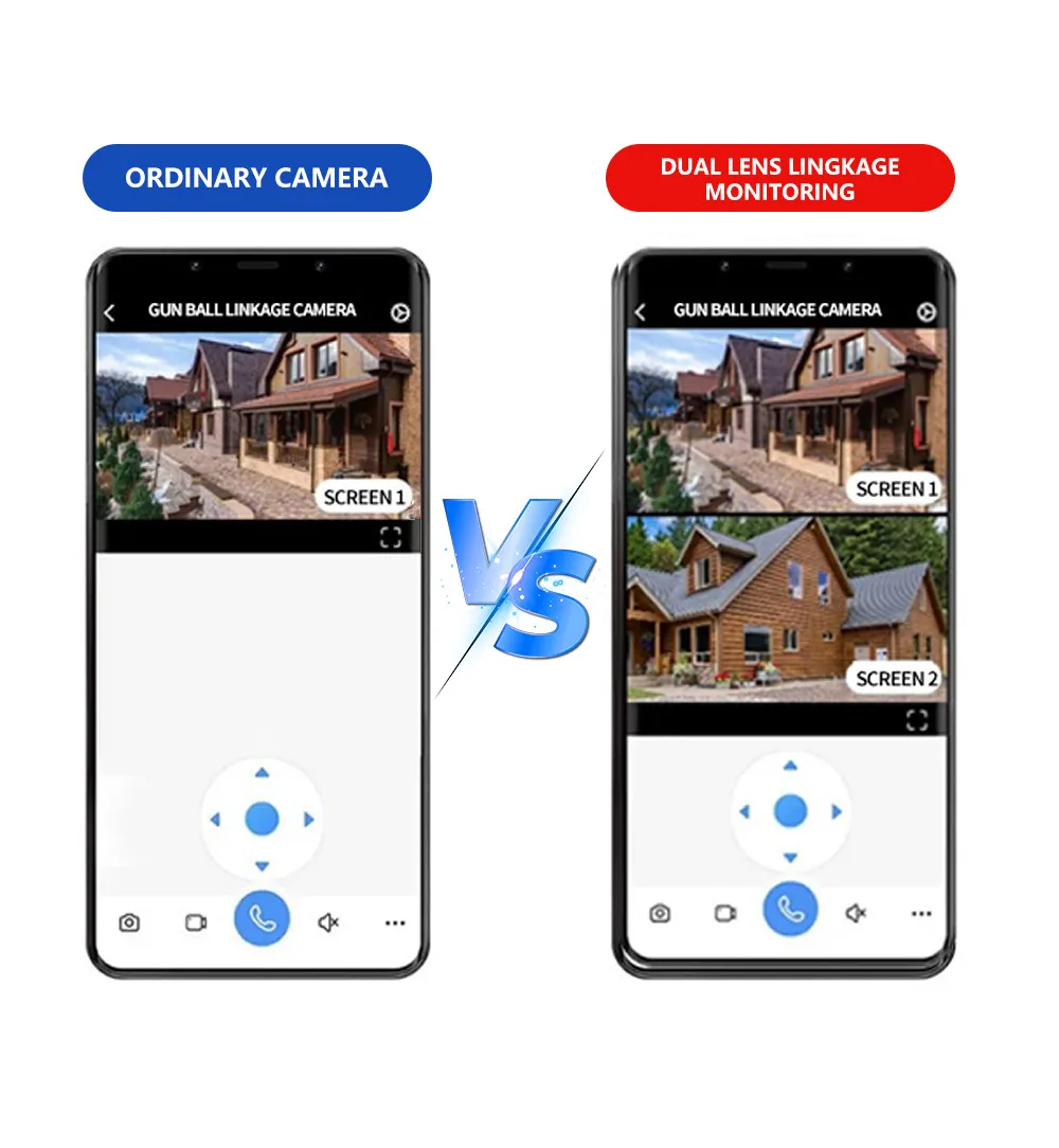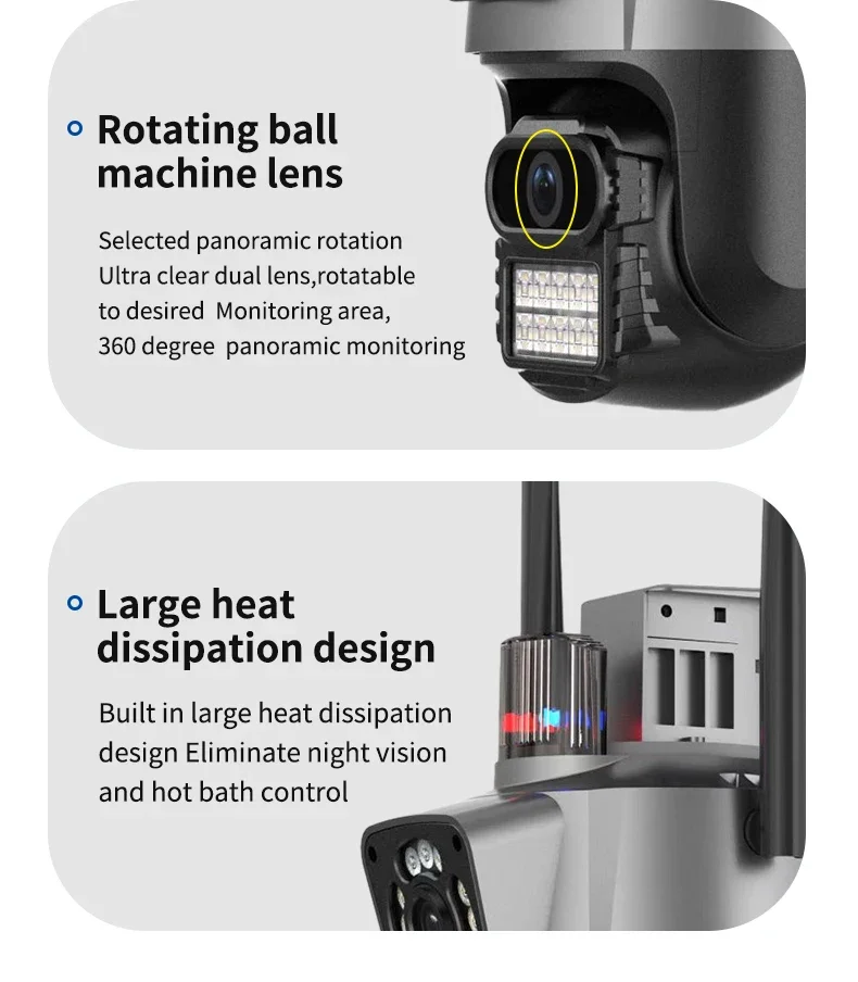 Dual lens, Dual screen, Police Light alarm, humanoid tracking, two way voice intercom 360 monitoring, full color night vision, IP66 waterproof, mobile phone remote monitoring,Share video, SD card storage, 24 hours video recording