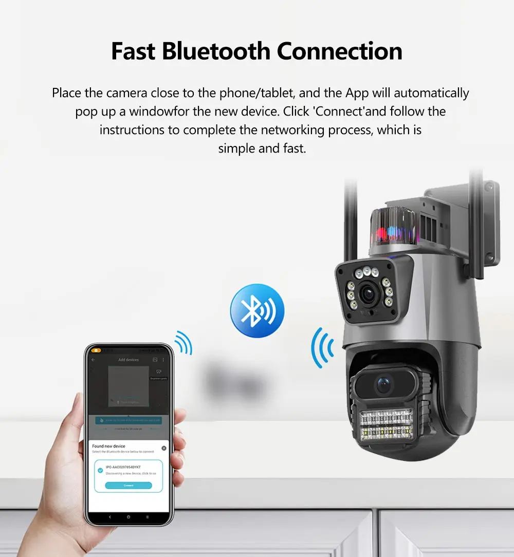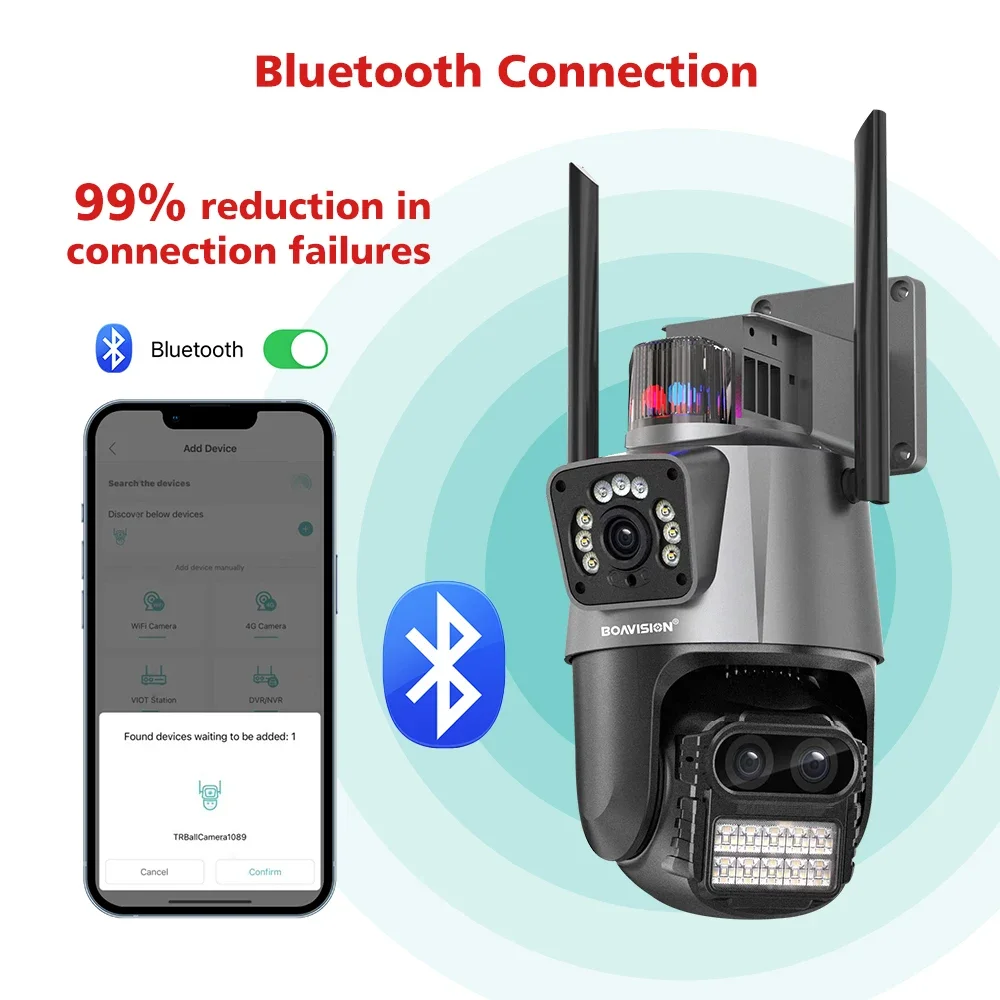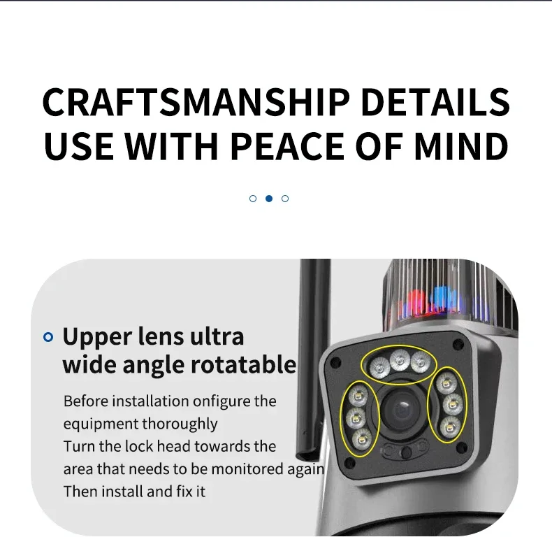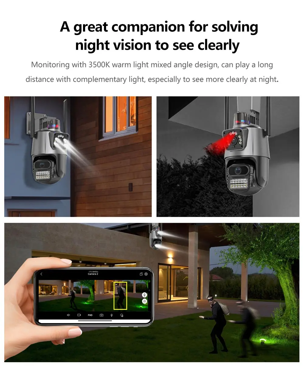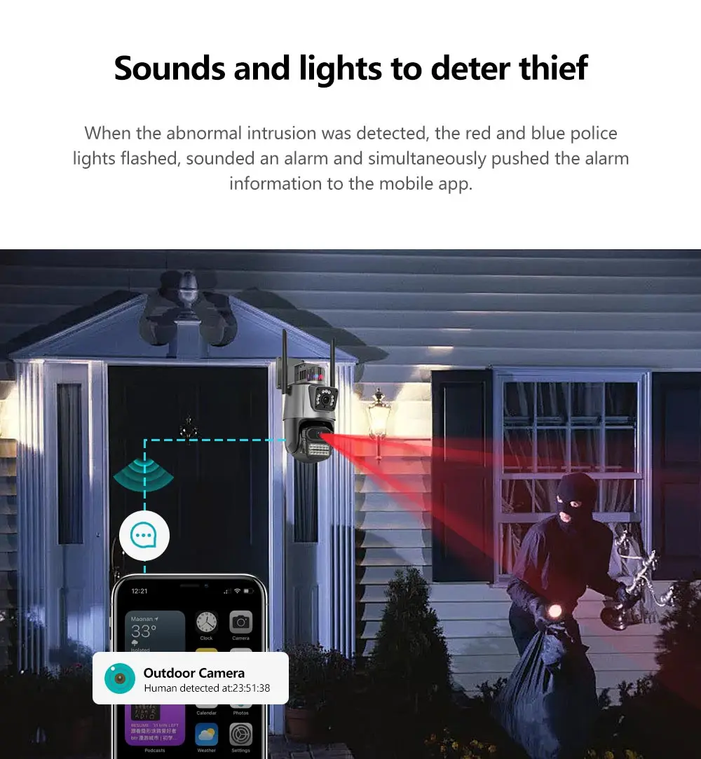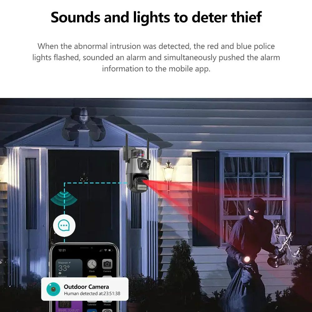 Dual lens, Dual screen, Police Light alarm, humanoid tracking, two way voice intercom 360 monitoring, full color night vision, IP66 waterproof, mobile phone remote monitoring,Share video, SD card storage, 24 hours video recording