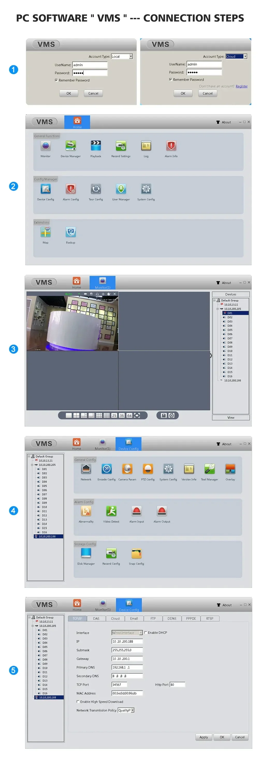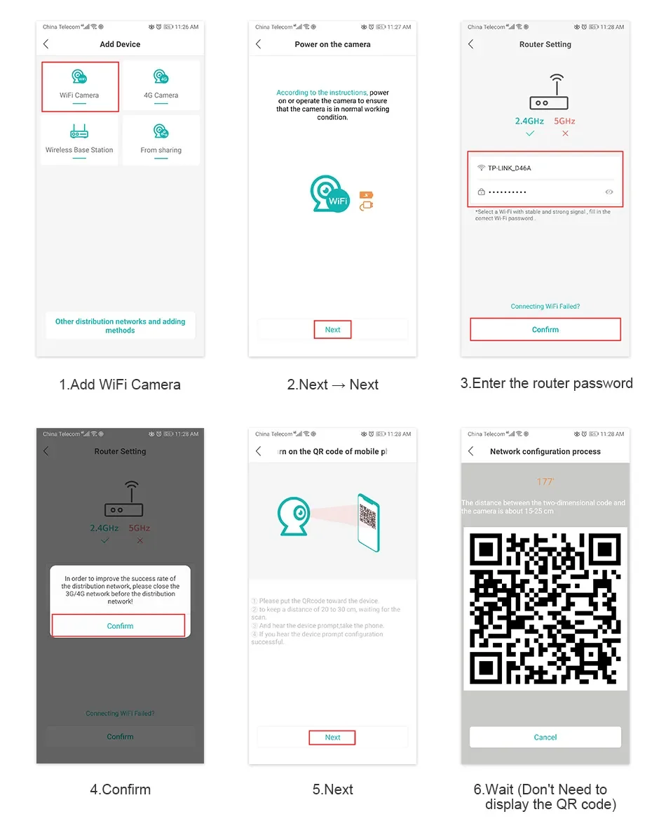 ③ Connect the camera through the 2.4G HZ Wifi network band, follow the 6 steps in the picture to connect, and you can configure it successfully.