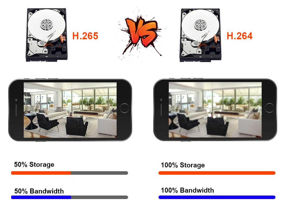 H.265 More Clear , HD resolution offer you best image quality in a lower bit rate.Save more storage space,can reduce 40%-50% file size,save your HDD storage space and reduce your purchase cost.