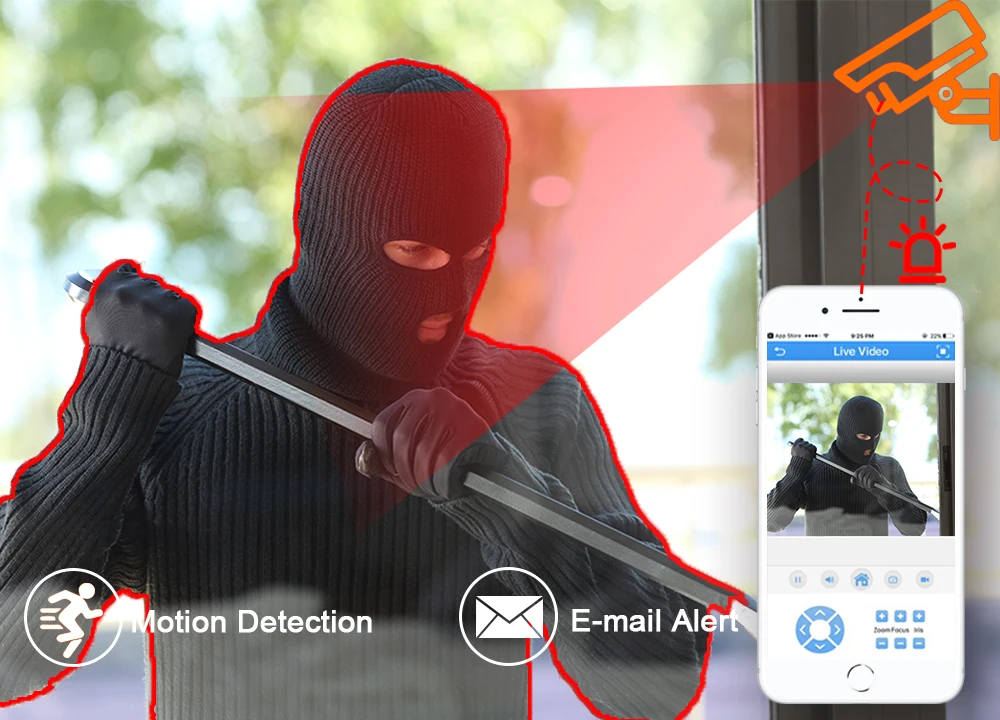 Can set up the area you want to control,When it is triggered,it will send message to your email ,