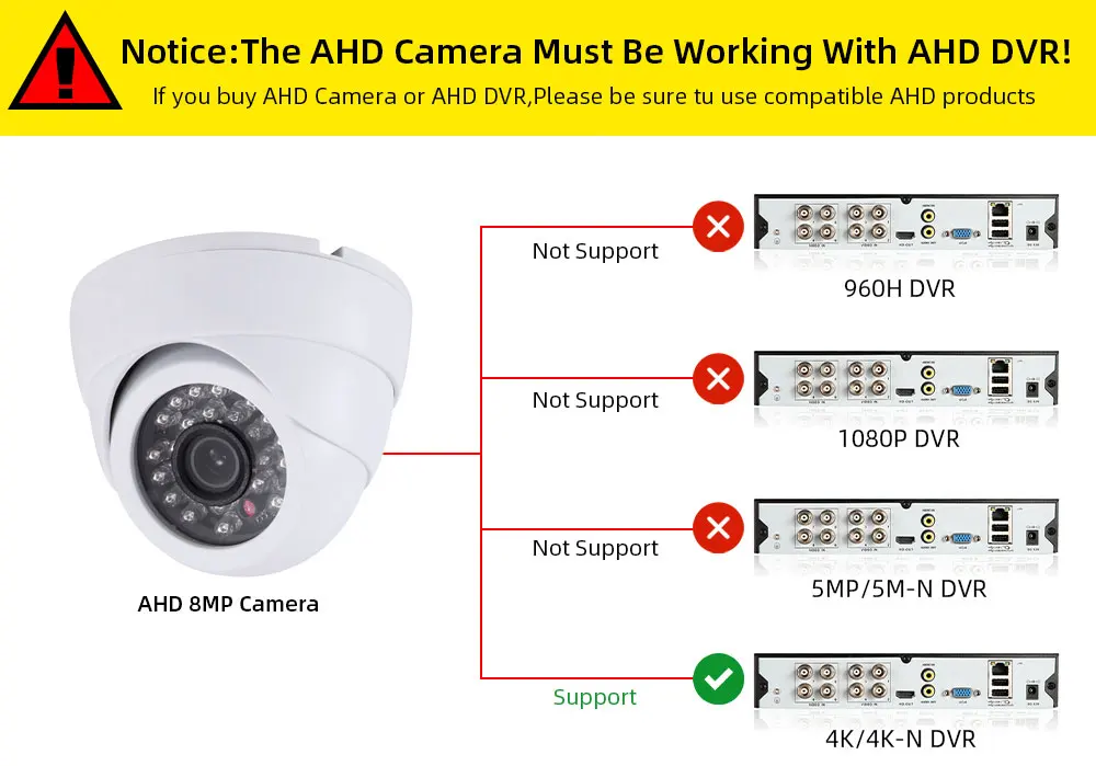 This is Super HD 8MP Camera ,Work Must use 4K AHD DVR or 4K-N AHD DVR !!!!, If no have, 8MP AHD Camera Not Work .Can't use “AHD 5MP System””AHD 5M-N System”and”AHD-H 1080P System”,”AHD 1080N System” and “AHD AHD-M 720P System” AHD DVR or “Common DVR” ,The 8MP AHD Camera Not Work!!!