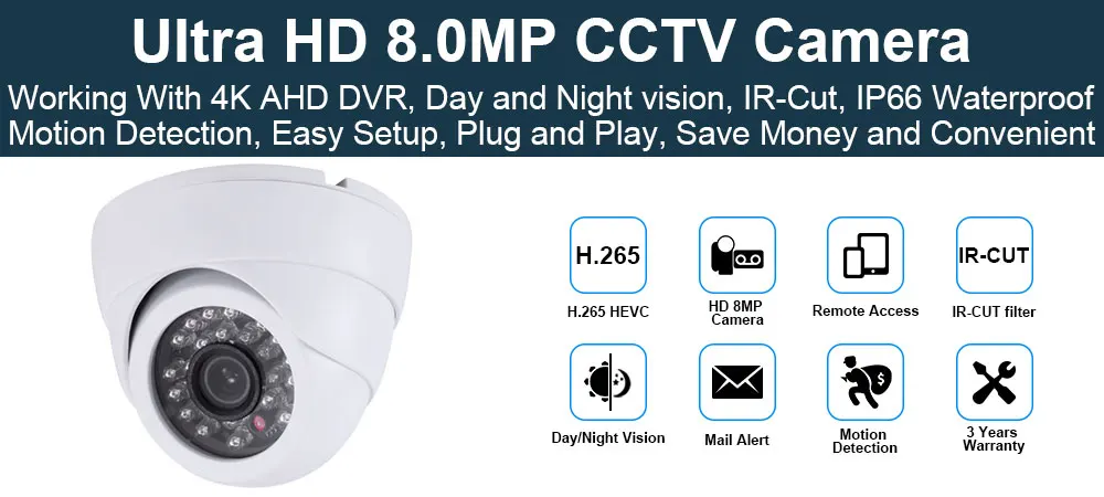 High-Definition interface output,Suport for online playback,Mobile remote,Multi-window display with 8.0MP Resolution.The angle will be more larger,and the image will be more clearer.