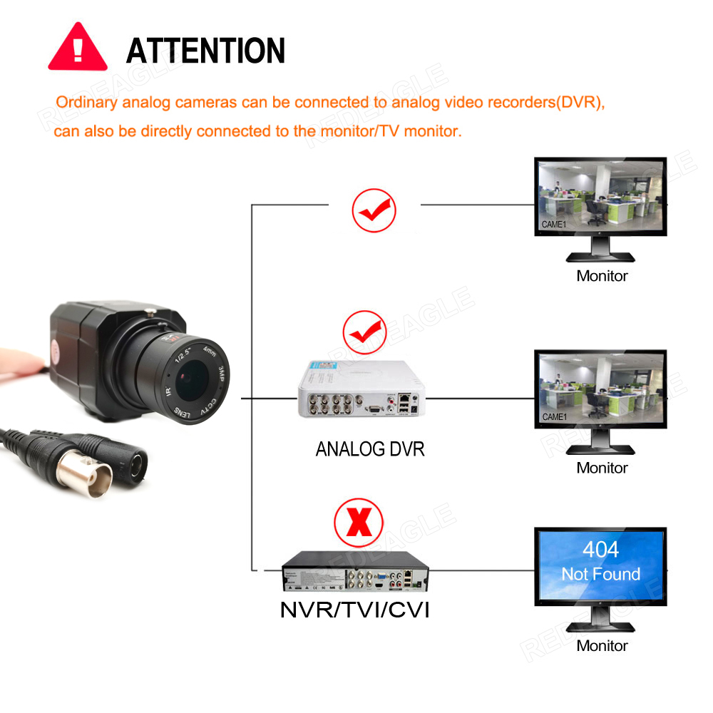 Ordinary analog cameras can be connected to analog DVR, also can be directly connected to LCD monitors.
