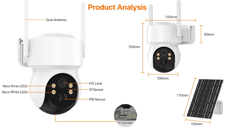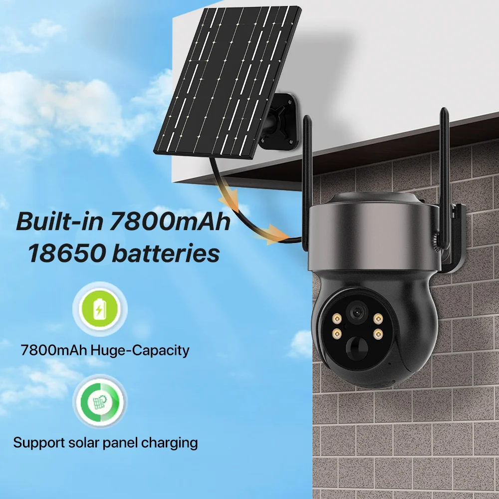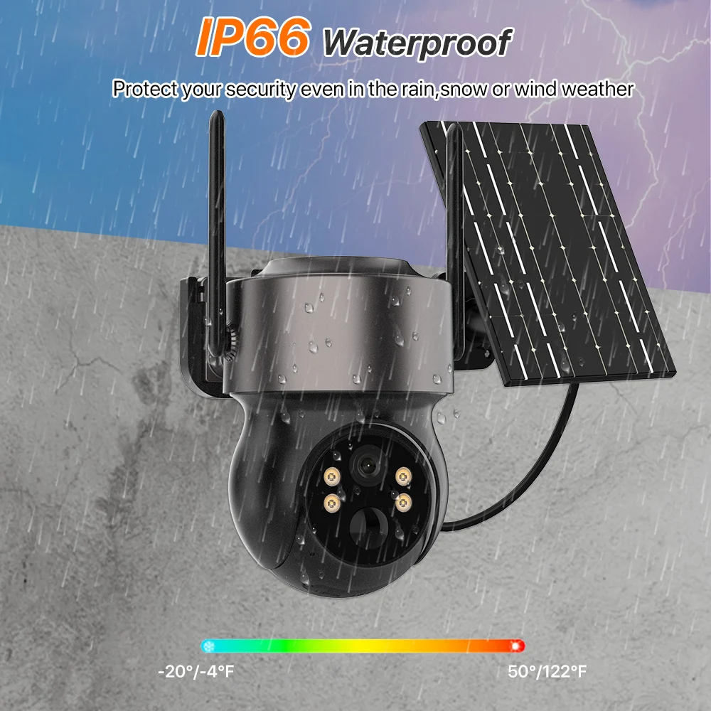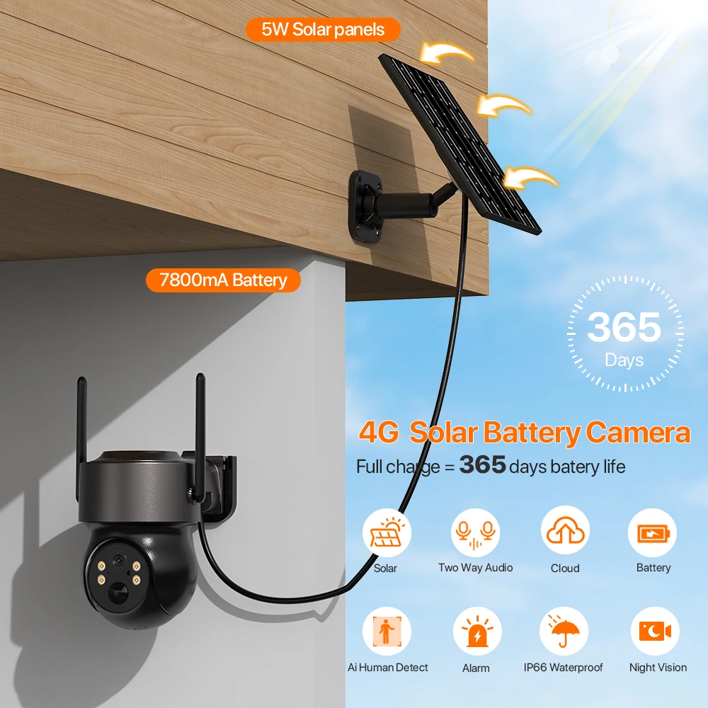 ● 7W solar panel, battery powered camera;