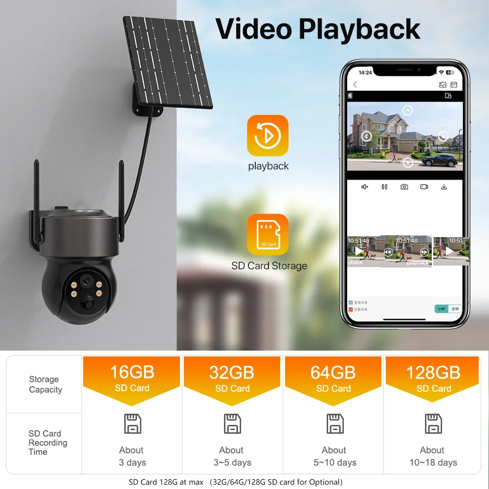 The camera support SD-card up to 128GB and Cloud Storge, you can save important videos and photos.