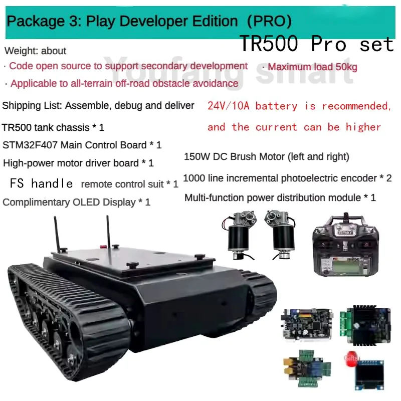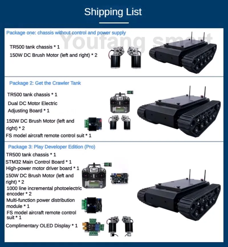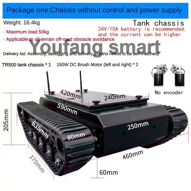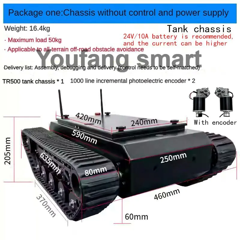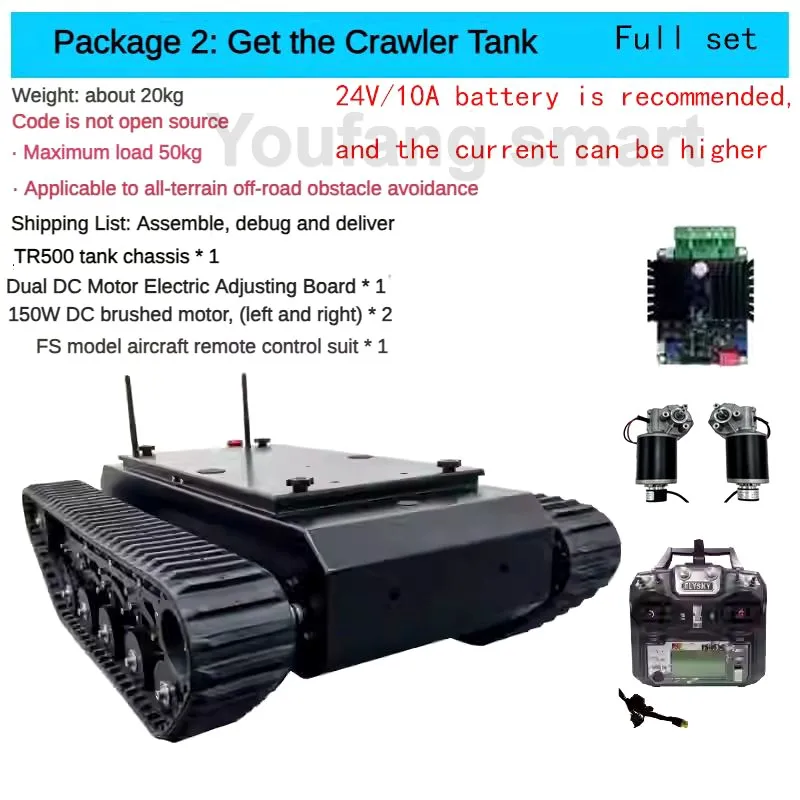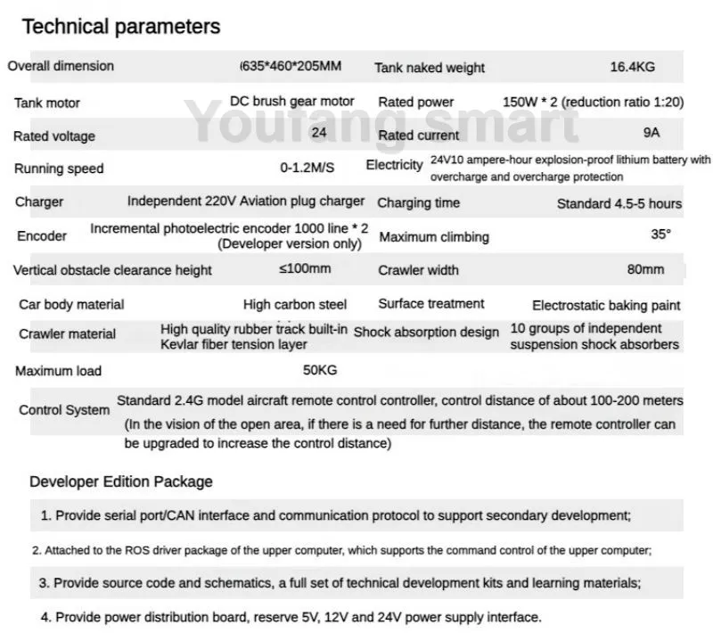 Not includes any Battery(You need to prepare battery by yourself for tank chassis power supply, what we recommend is 24V Li battery with 10Ah working current, and we will prepare you XT60 male plug, which you can power on it directly when your battery is XT60 female plug)