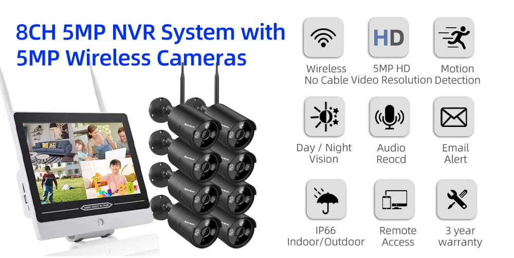 This wireless security camera system with 12.5 inch monitor, you can have a high definition image during the real time monitoring, you don’t have to buy a seperate screen, save more money, and more space. You just need power on the camera and NVR, then the images will show on the screen for you. The really plug and play. And you can view the 8 cameras at the same time on the screen.
