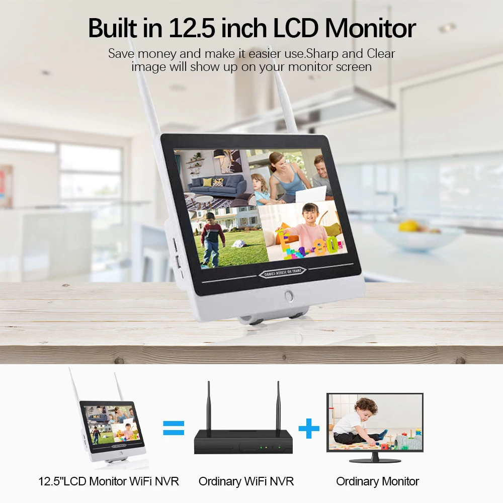 5MP 8CH Wireless Audio CCTV Security Camera System H.265 12.5 Inch LCD Screen NVR WIFI Outdoor IP Camera With Wireless monitor