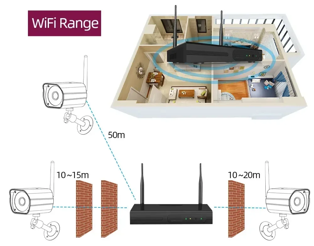 Wireless connections between cameras and NVR,Up to 50 Meters Wireless Transmission(no obstacle)