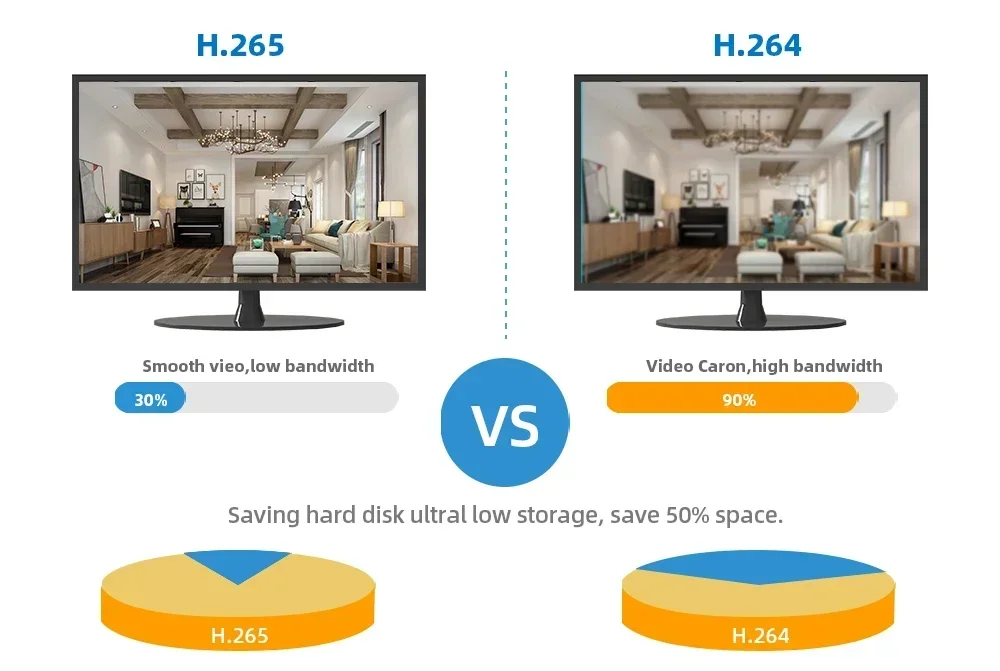 H.265 More Clear , HD resolution offer you best image quality in a lower bit rate.Save more storage space,can reduce 40%-50% file size,save your HDD storage space and reduce your purchase cost.