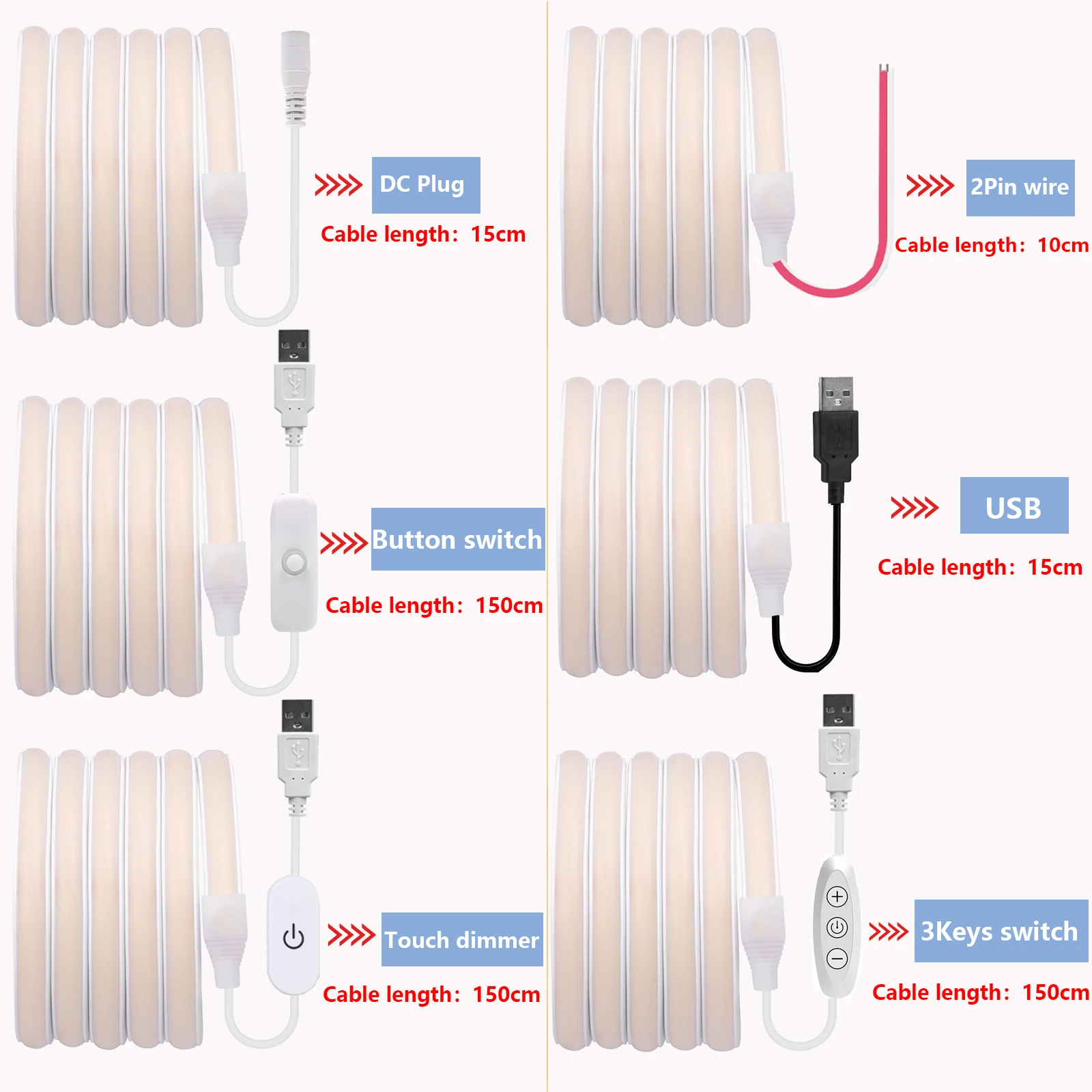 Power Supply Options: DC Plug/2Pin wire/USB/Switch Button/Touch Dimmer/3Key Switch