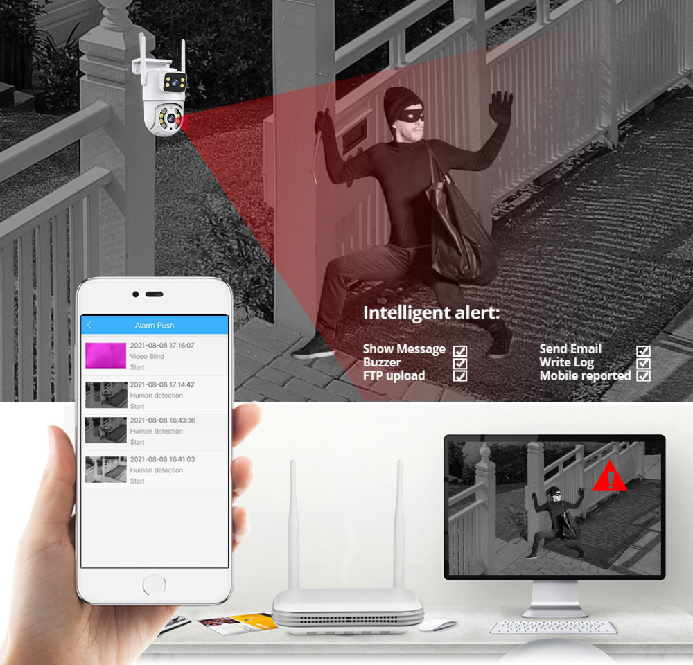 3. Dual-lens 3MP+3MP=6MP,dual-sensor dual-screen, wide-angle viewing + long-distance viewing, to achieve clear monitoring at far and near;