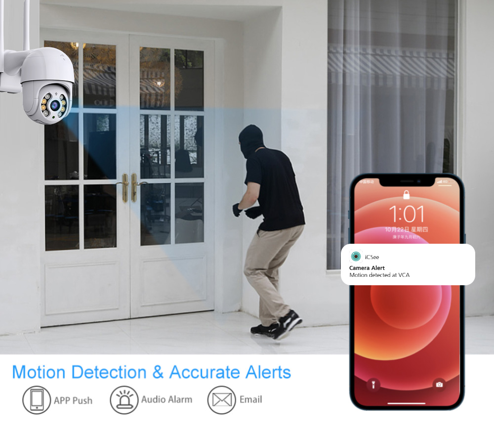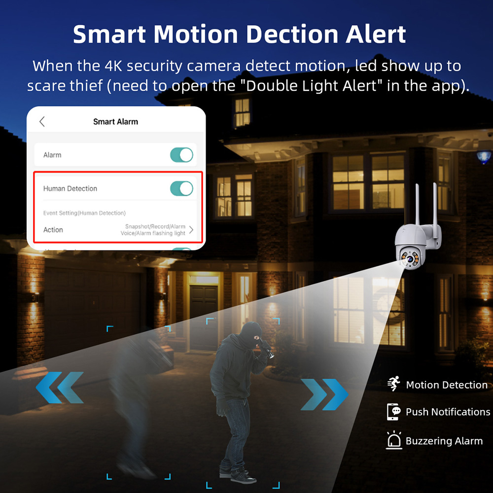 4. Dual light source design, built-in infrared light + white light, supports three modes (day vision, night vision, full-color night vision, infrared distance: 10-20M), and turns on full-color mode when movement is detected.
