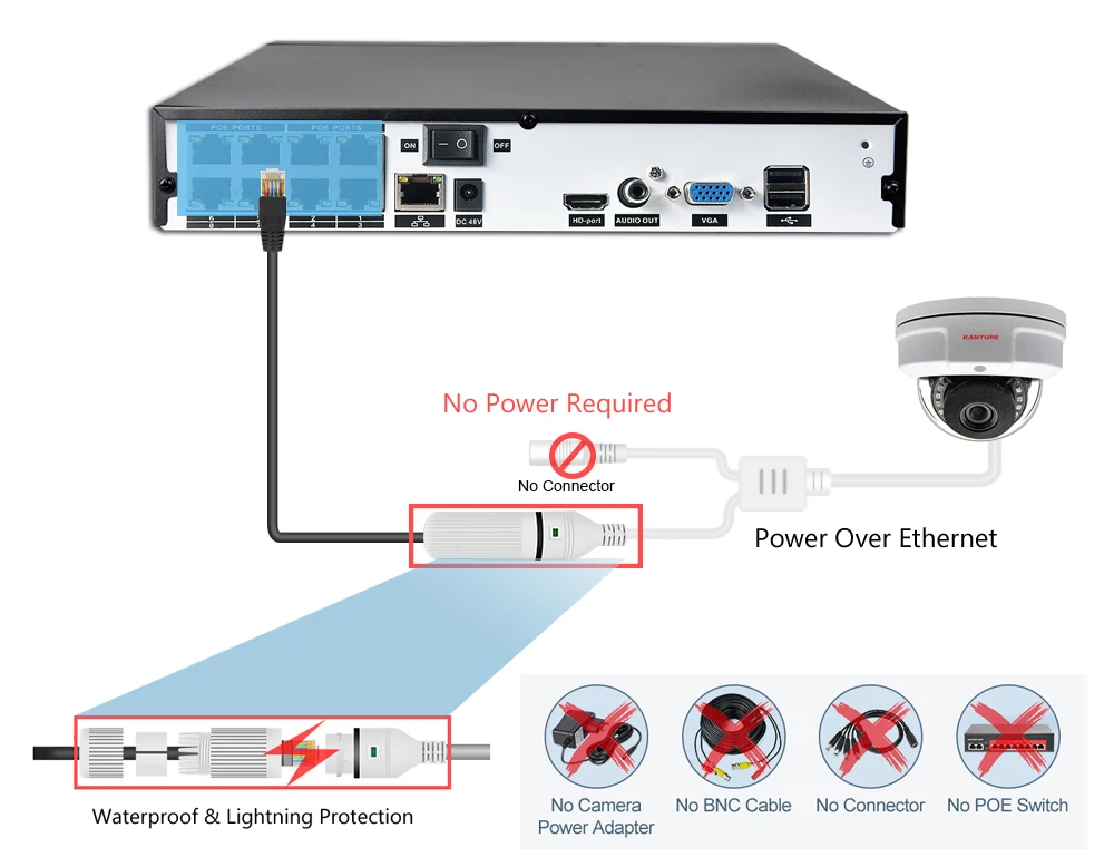 The Power over Ethernet (PoE) is an advanced technology, which enables you to use a single network cable for both video and power transmission, installation easier! Besides, thanks to PoE you will never worry about electric leaks!