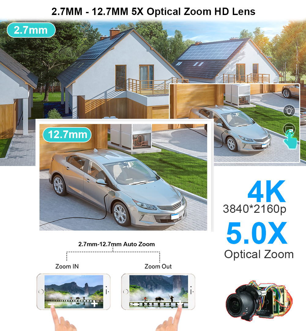 2.7-13.5mm Lens 5X Optical Zoom Camera You Can View Clear image from Far Away,also you Can Zoom in To See More Details of Far-Away Objects, Or Zoom Out To Get a Wider and Larger View