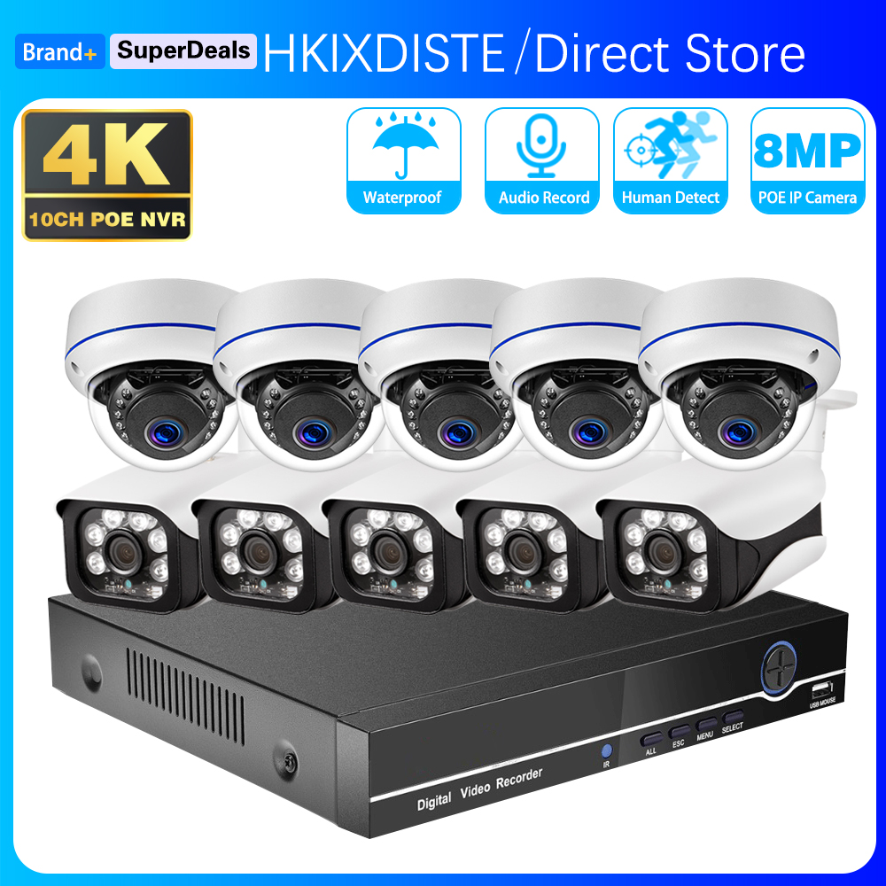 8MP 4K Security lP Camera System Audio Record Waterproof Outdoor 10CH POE NVR Human Detection CCTV Bulet Home Surveillance NVR